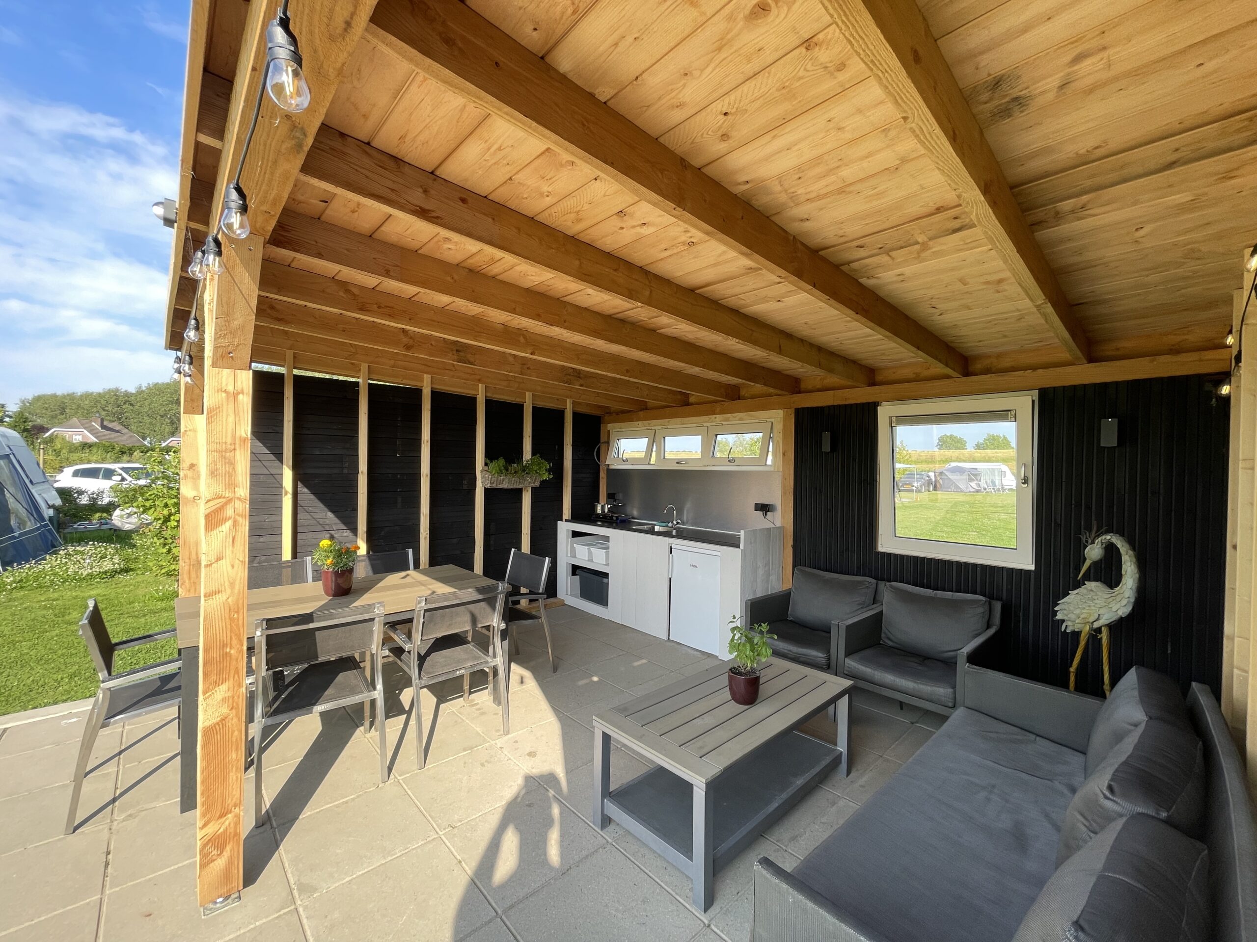 Naast de kapschuur is een gezellige overdekte buitenkeuken. Hier is een koelkast, kookplaatje en benodigdheden aanwezig.