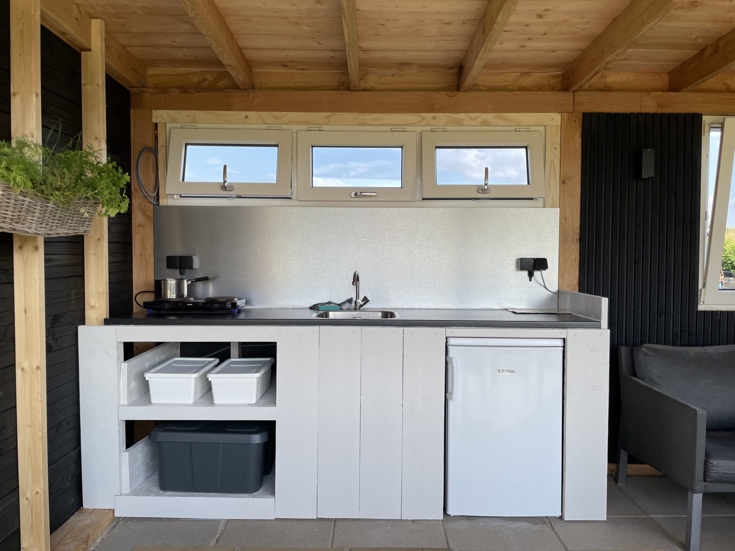 De buitenkeuken is ideaal gelegen in het hart van onze camping, tussen de sfeervolle accommodaties Kapschuur Joe en de knusse Pipowagens. Deze goed uitgeruste keuken biedt alles wat je nodig heeft om een eenvoudige maaltijd te bereiden. Je vind er een ruime koelkast om uw etenswaren vers te houden, een handig elektrisch kookplaatje, en een uitgebreide collectie potten, pannen en andere kookbenodigdheden.