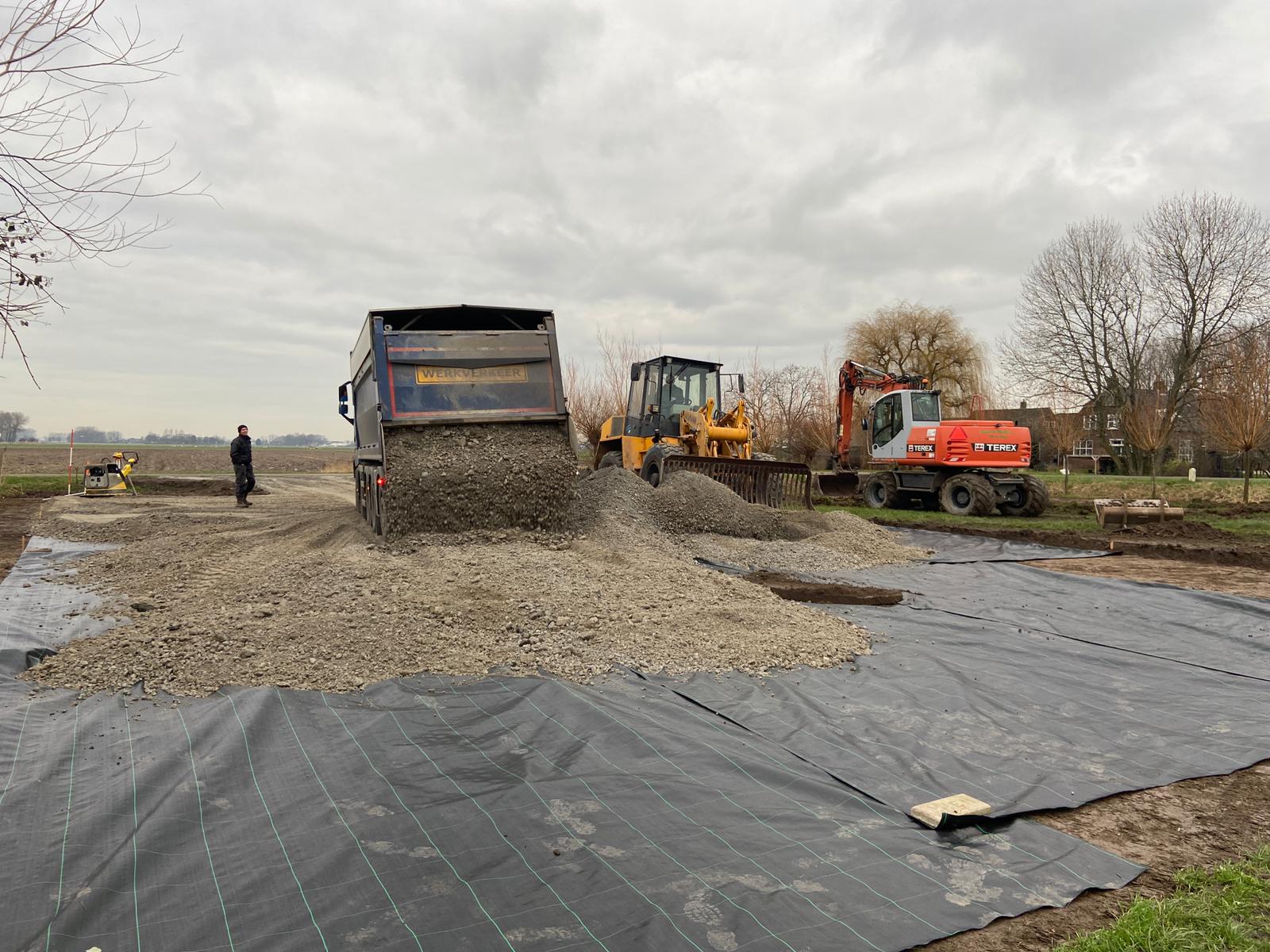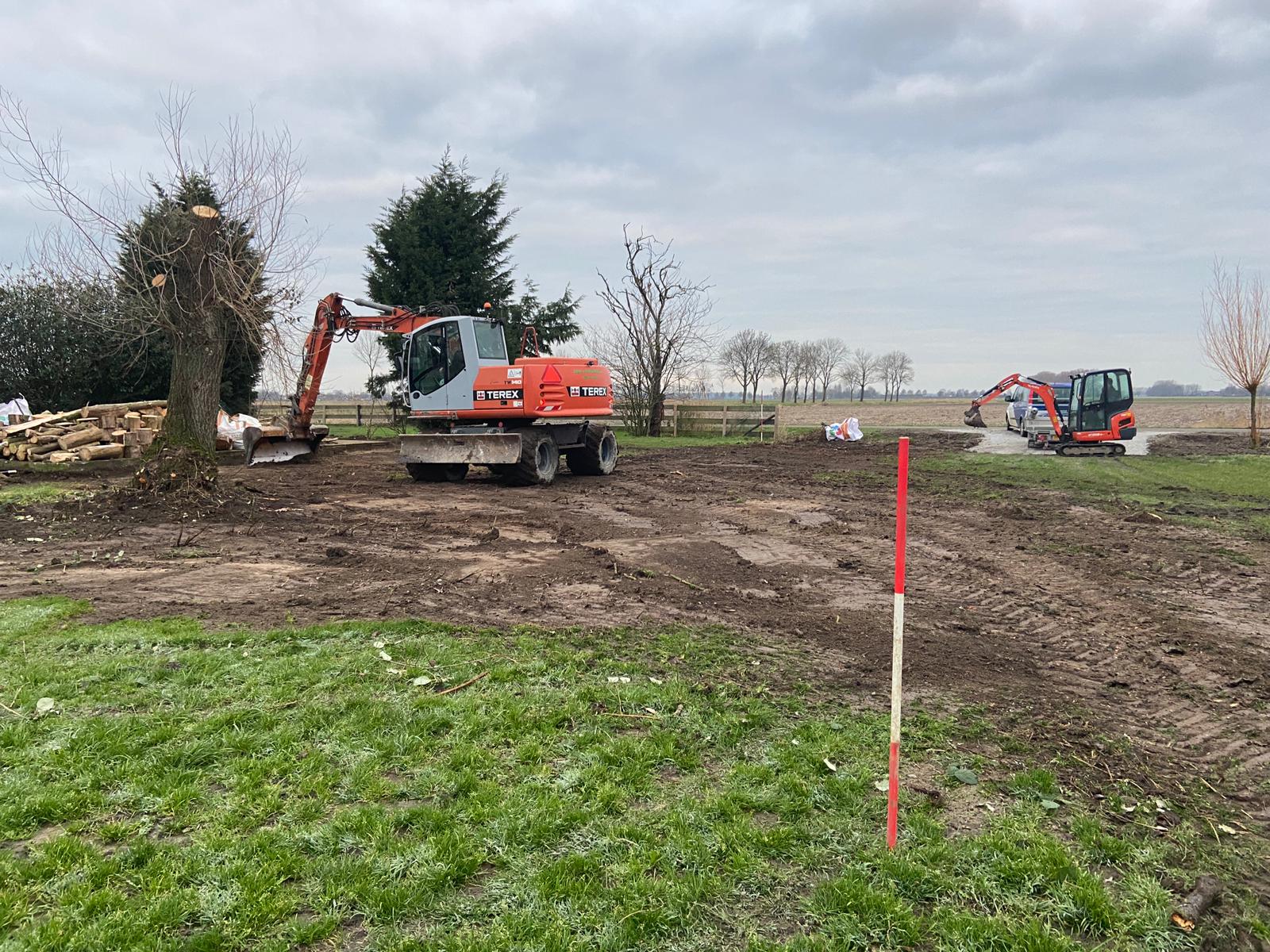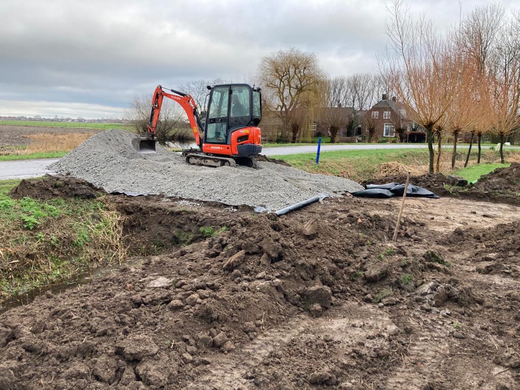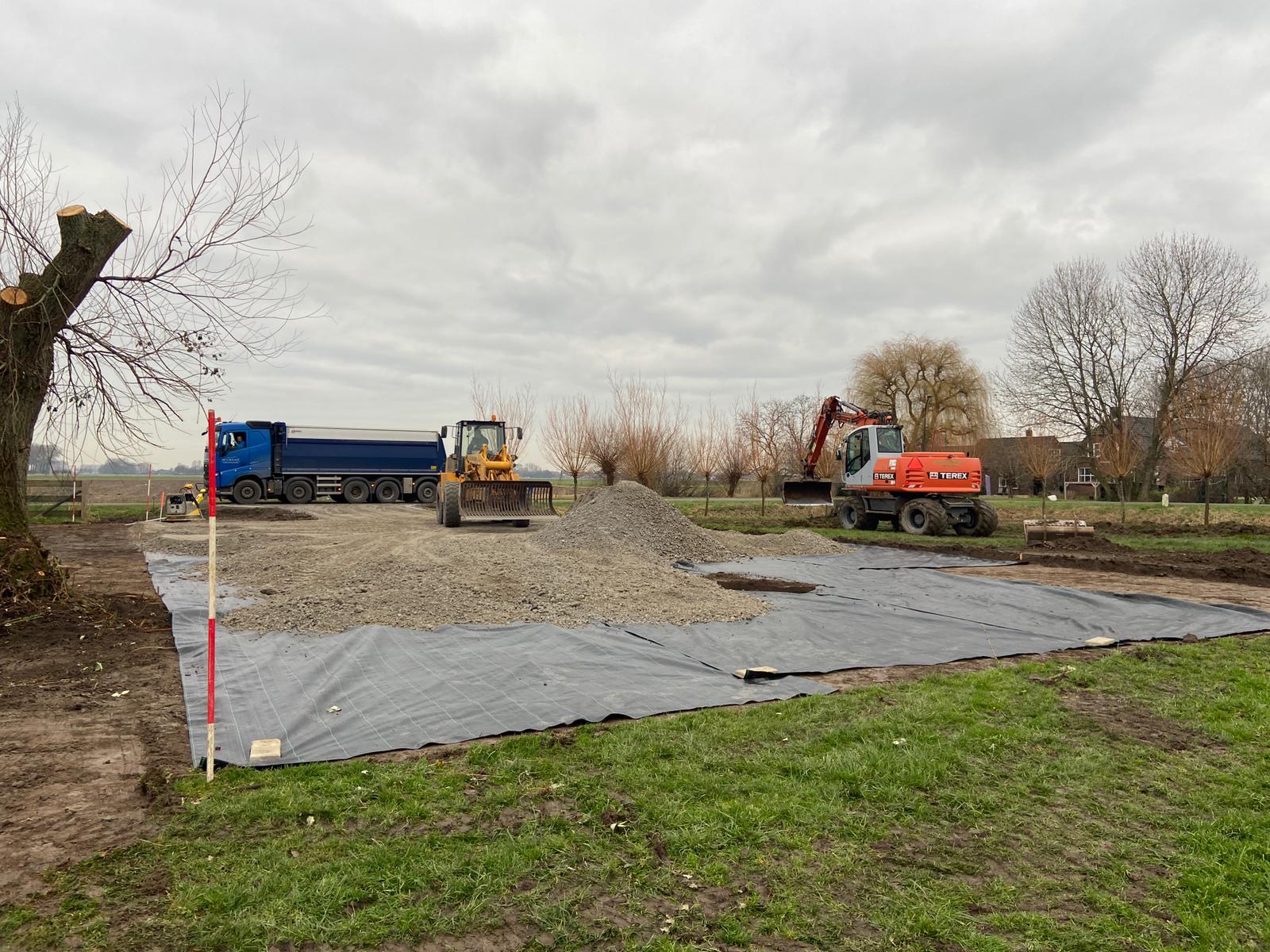 De inrit is uitgegraven en er is verharding aangebracht. Alles rondom de inrit en parkeerplaats is opgeruimd en vrij gemaakt. De parkeerplaats is uitgegraven en de grond in een wal er rondom heen gelegd en de verharding voor de parkeerplaats is aangebracht.