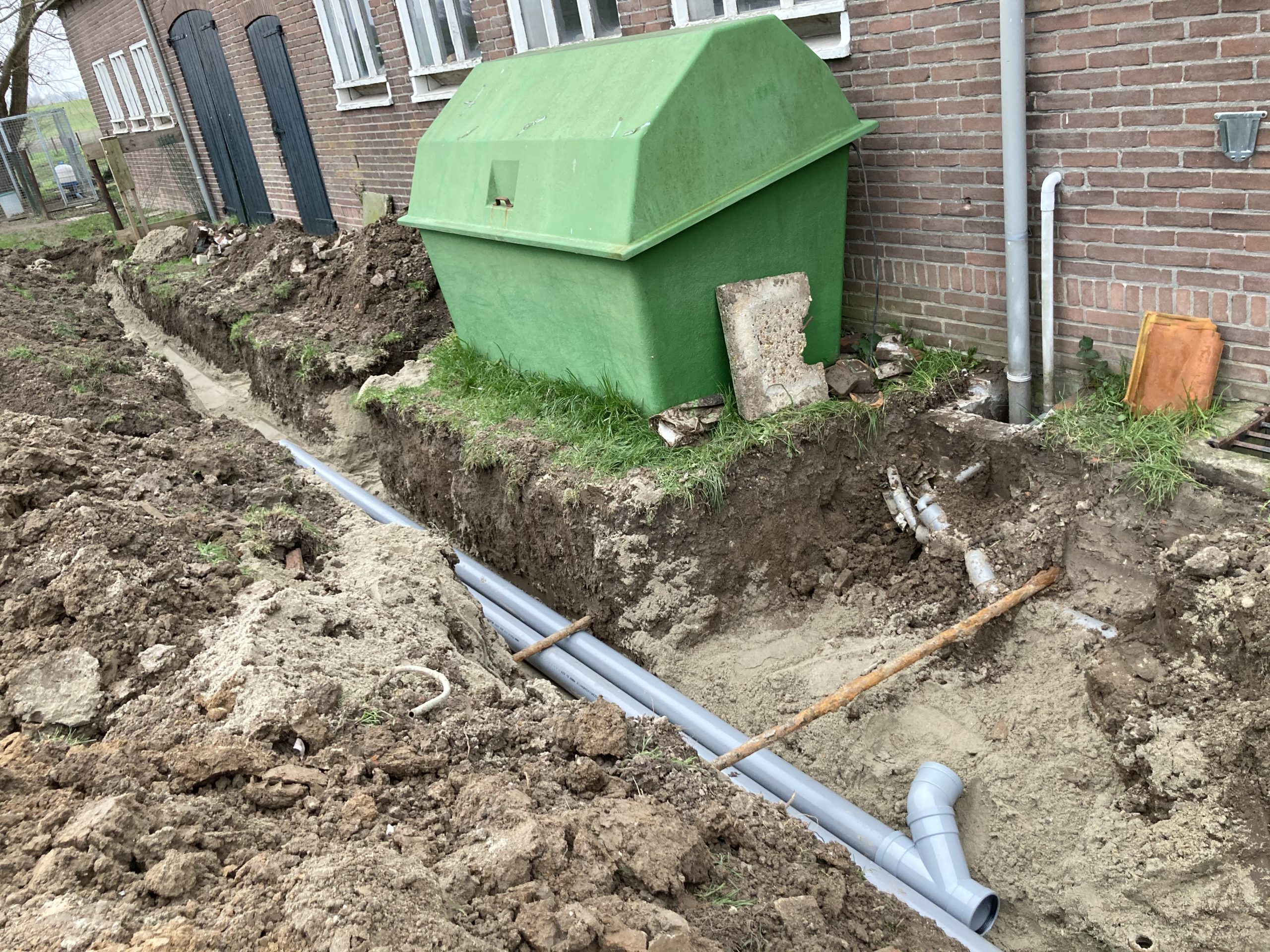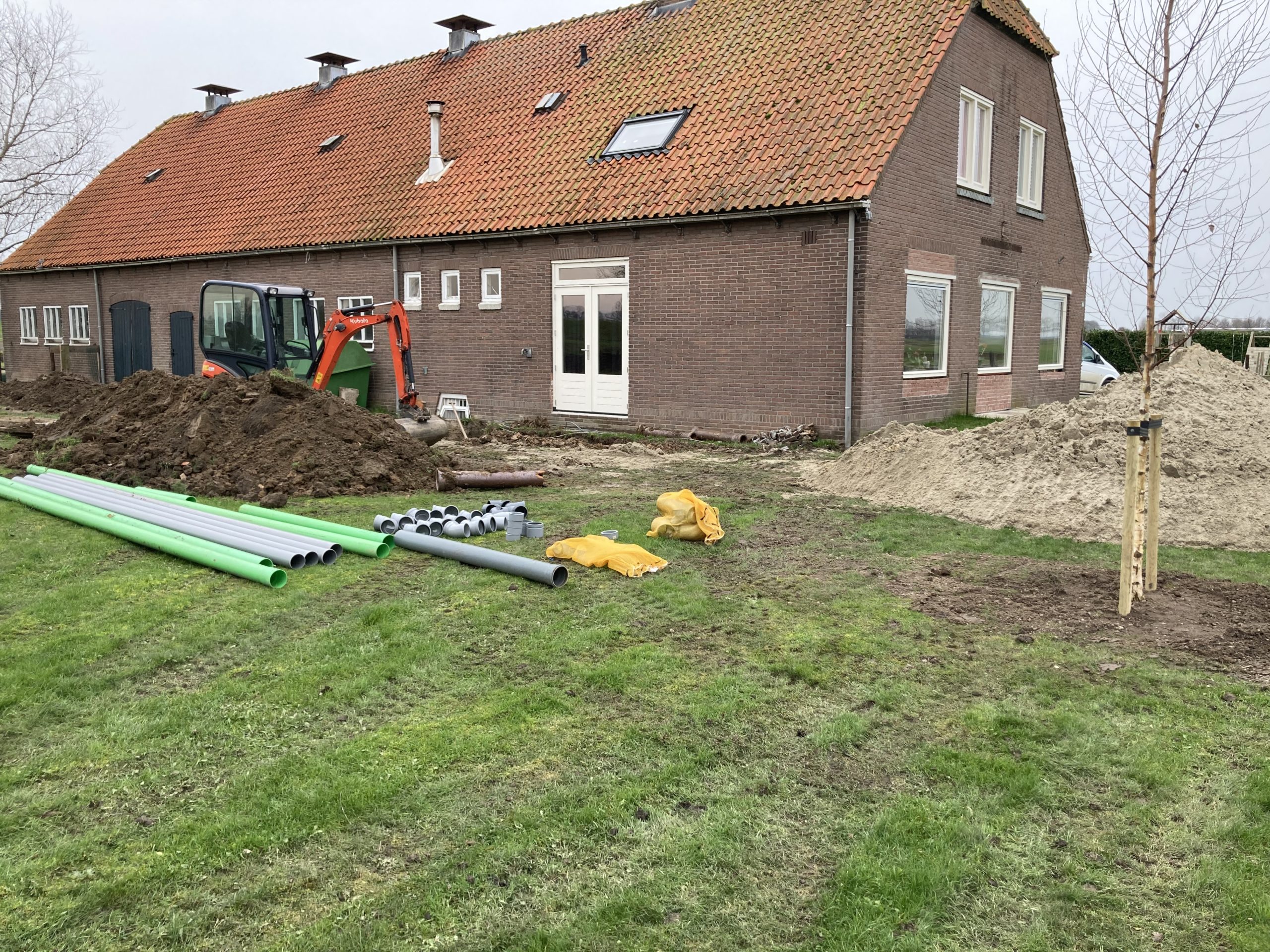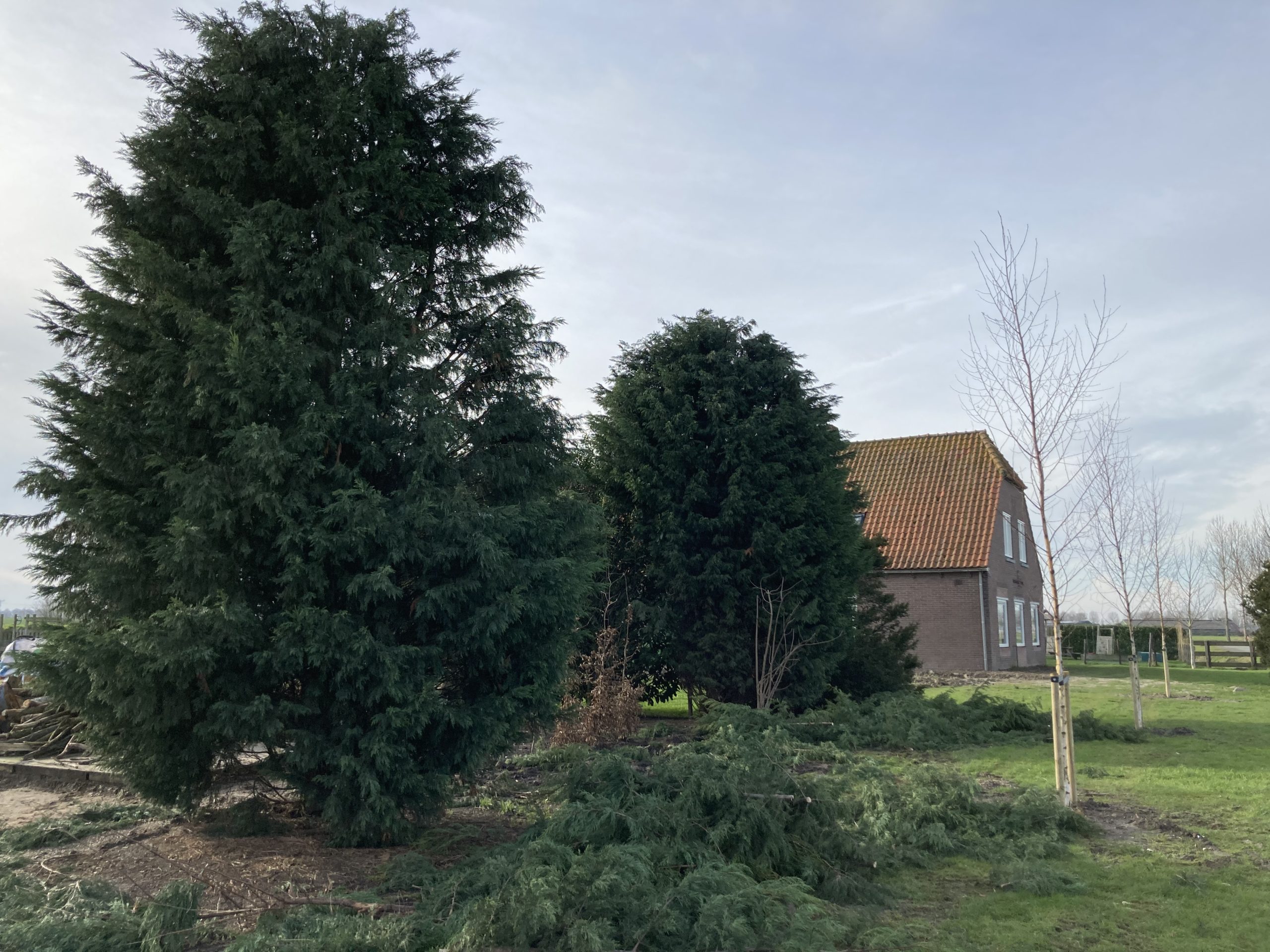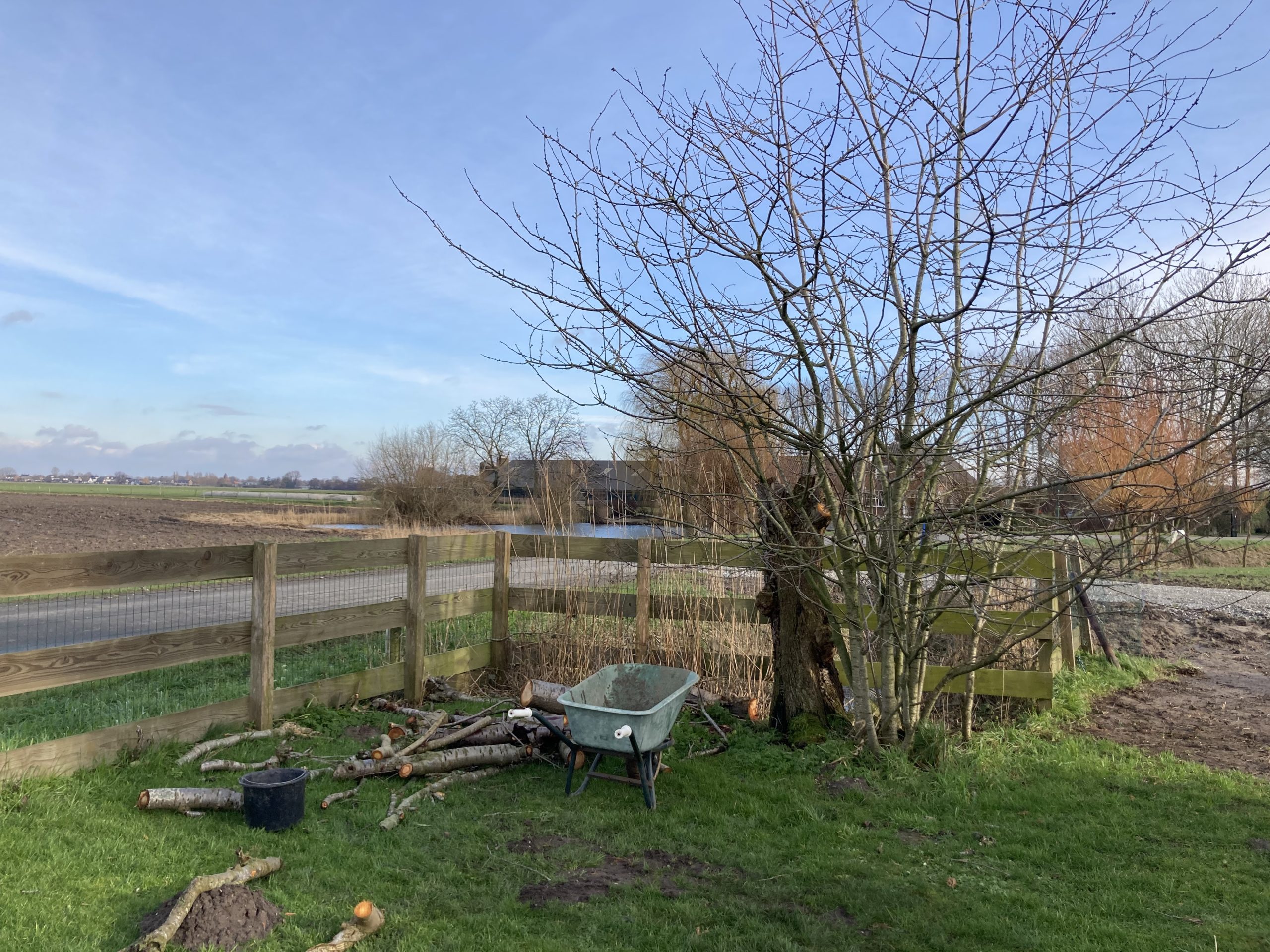 We hebben de coniferen 2 meter korter gemaakt en ze weer wat vorm gegeven. Ook de oude kersenboom is flink terug gesnoeid. Bij de boerderij is veel grond- en rioolwerk verzet. De hondenweide is (tijdelijk) 50% kleiner geworden.