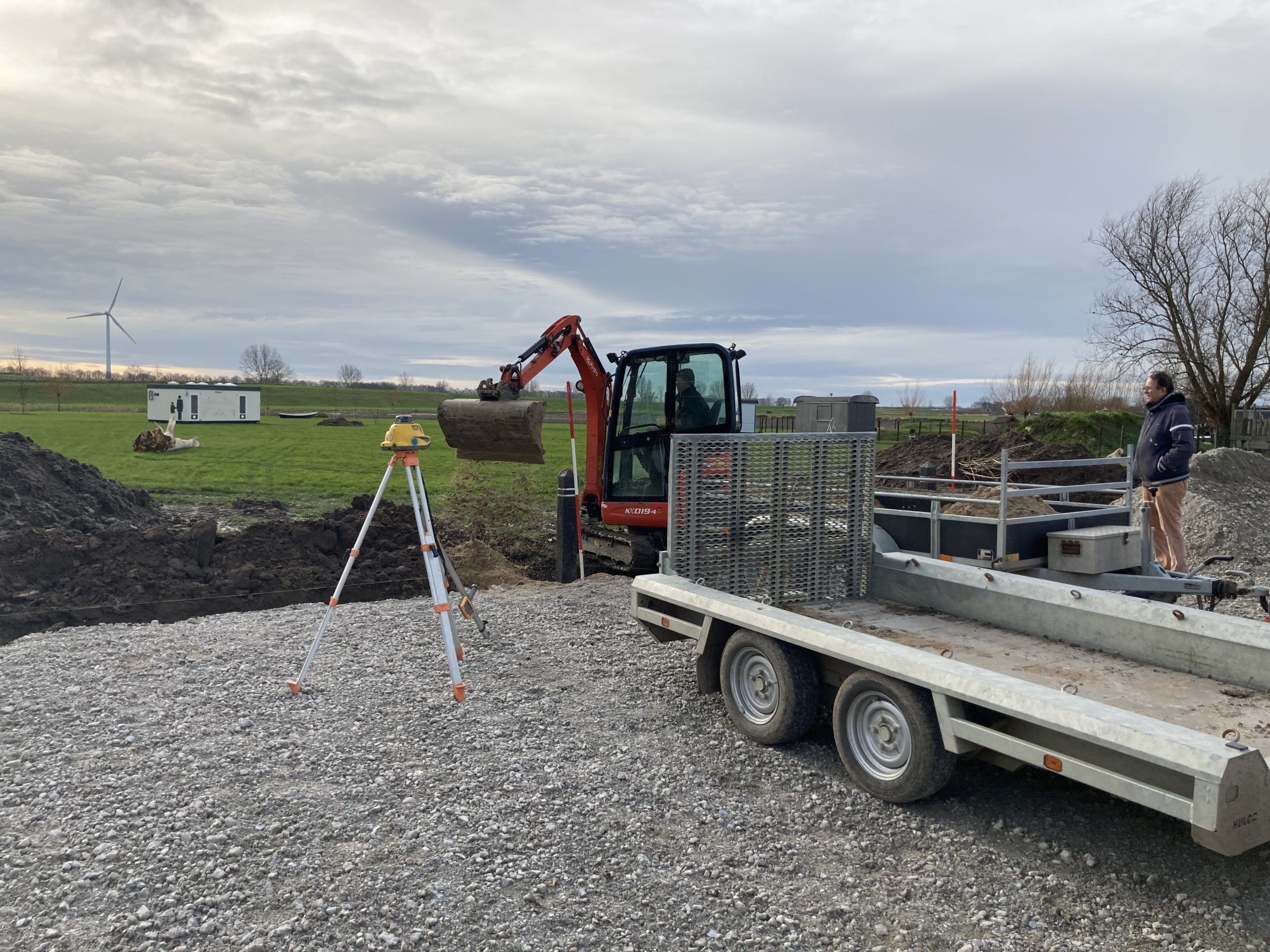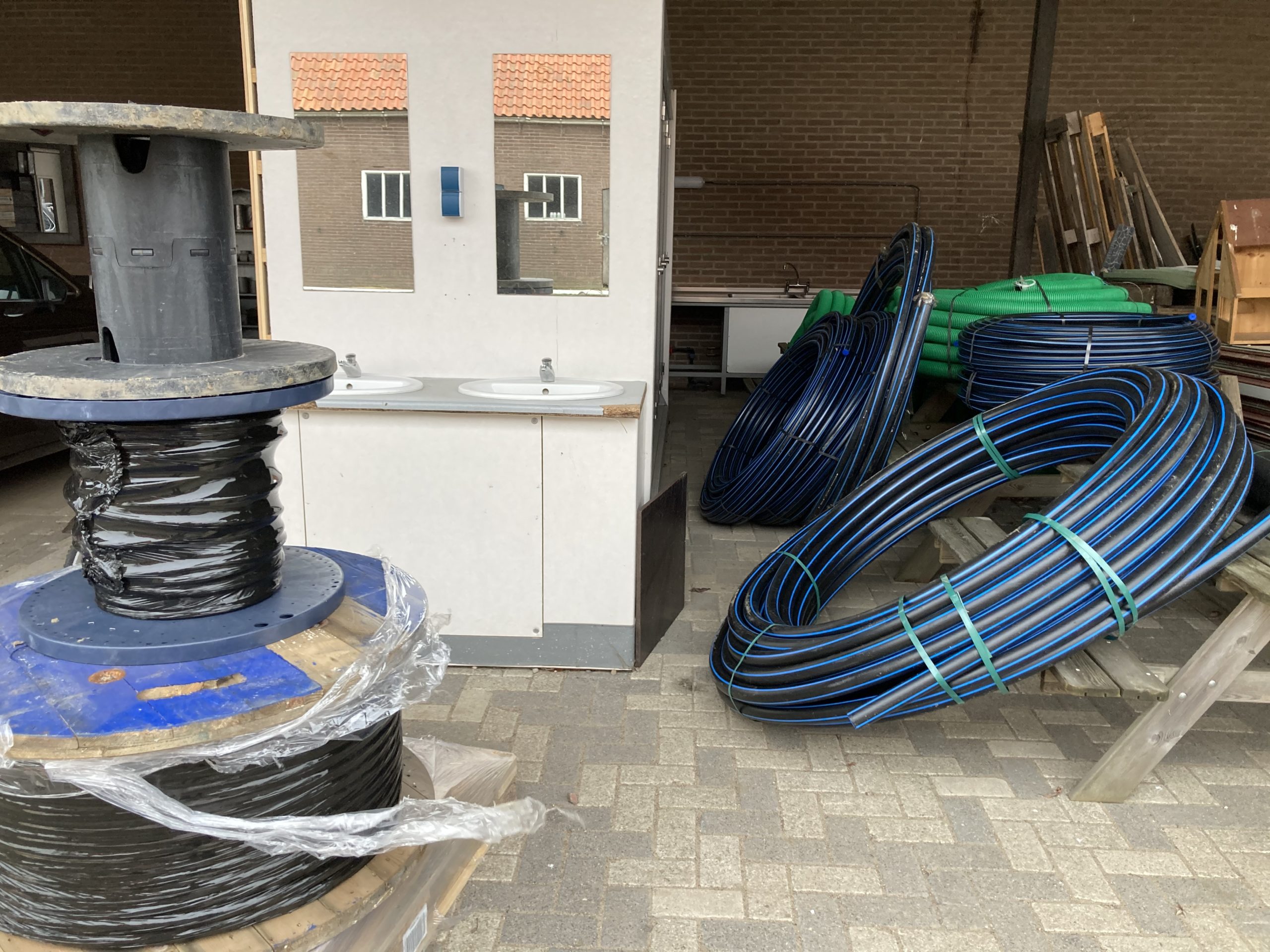 De spullen voor komende week staan al weer klaar. We gaan o.a. de sleuven graven voor alle leidingen naar het sanitair gebouw toe (afvoer, water, stroom en data).