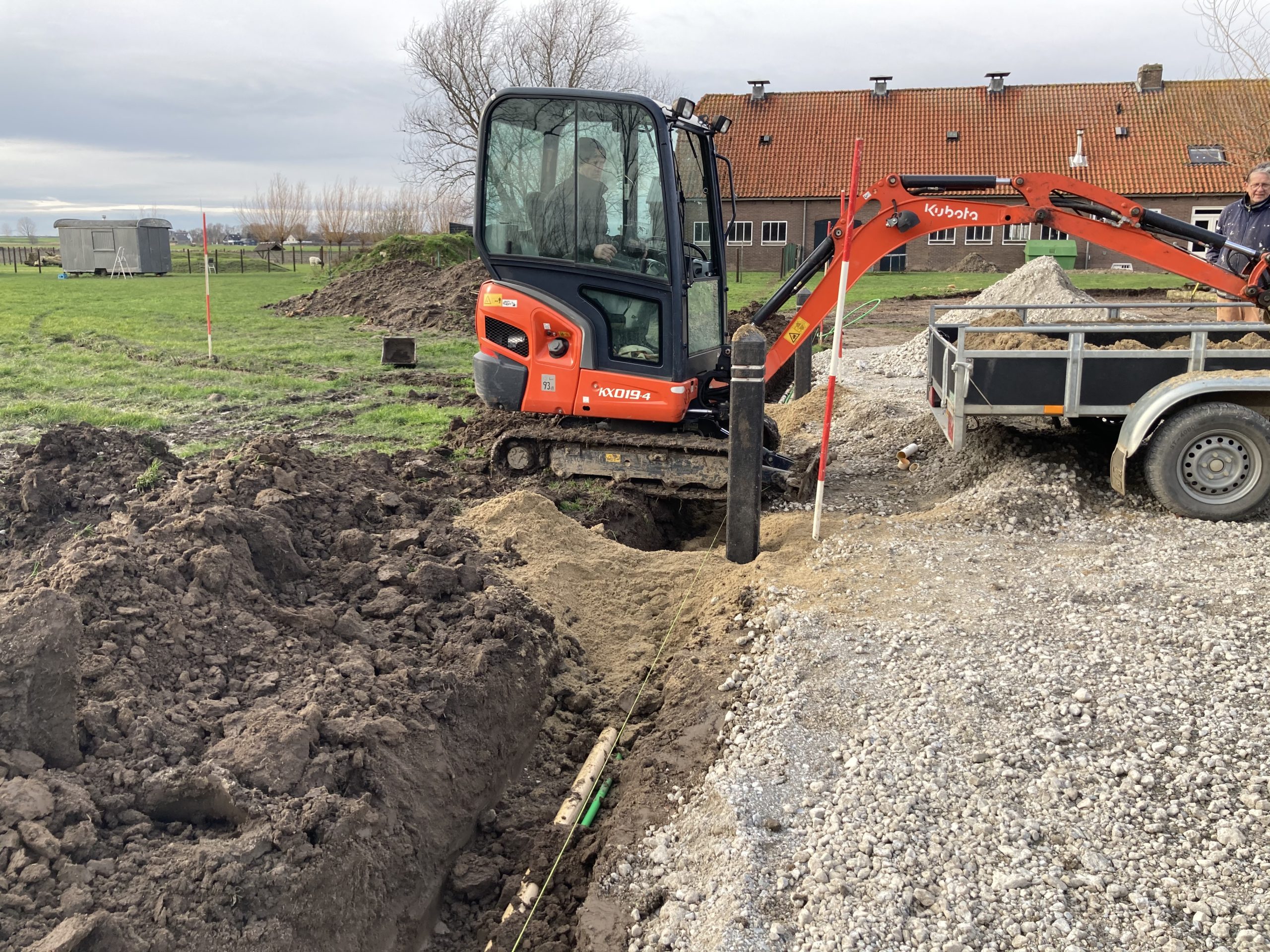 Deze week hebben we verder gewerkt aan de parkeerplaats en doorgang naar de camping toe. We hebben paaltjes geplaatst, leidingen gelegd voor water en stroom langs de parkeerplaats en naar de inrit toe.