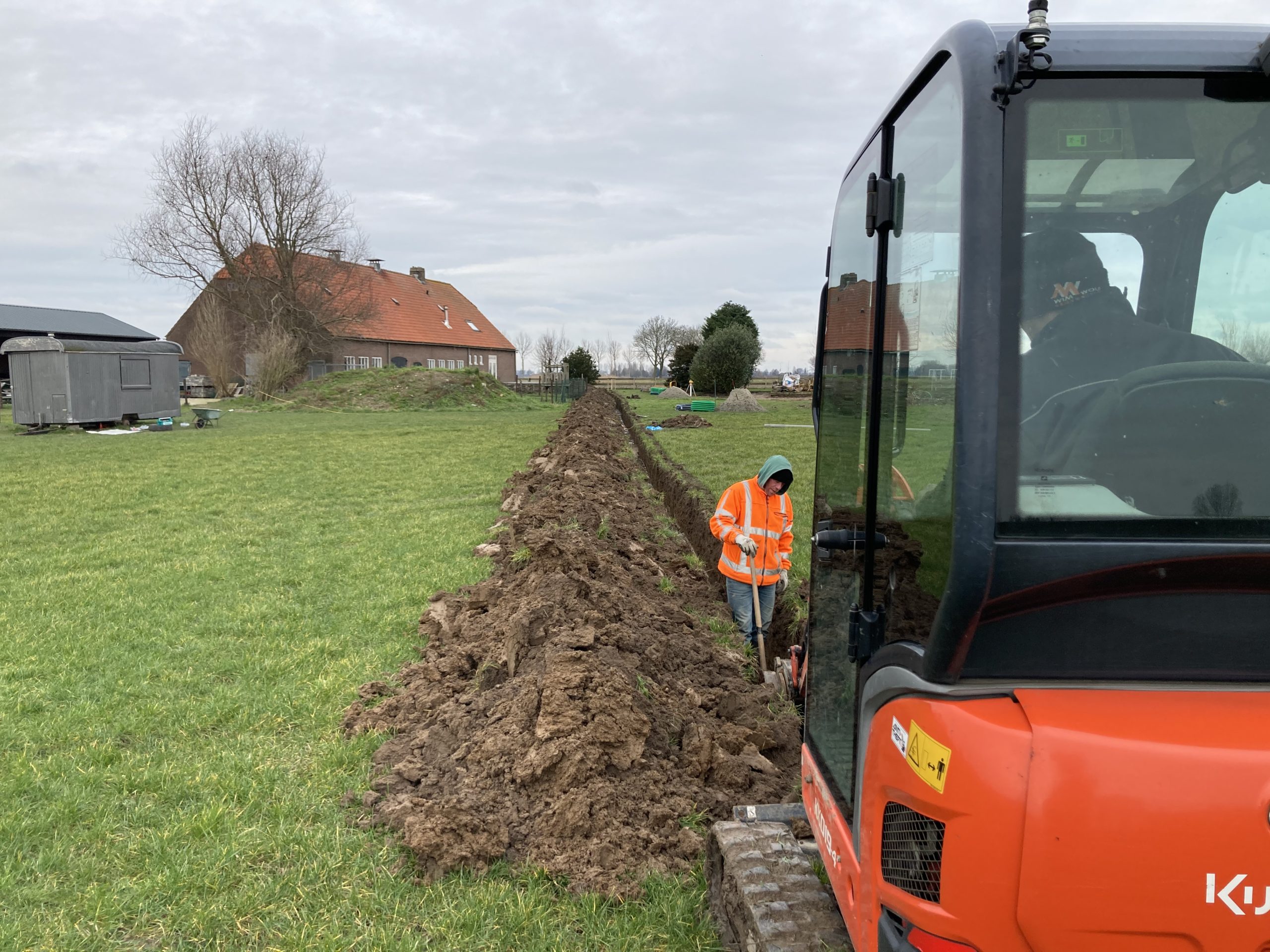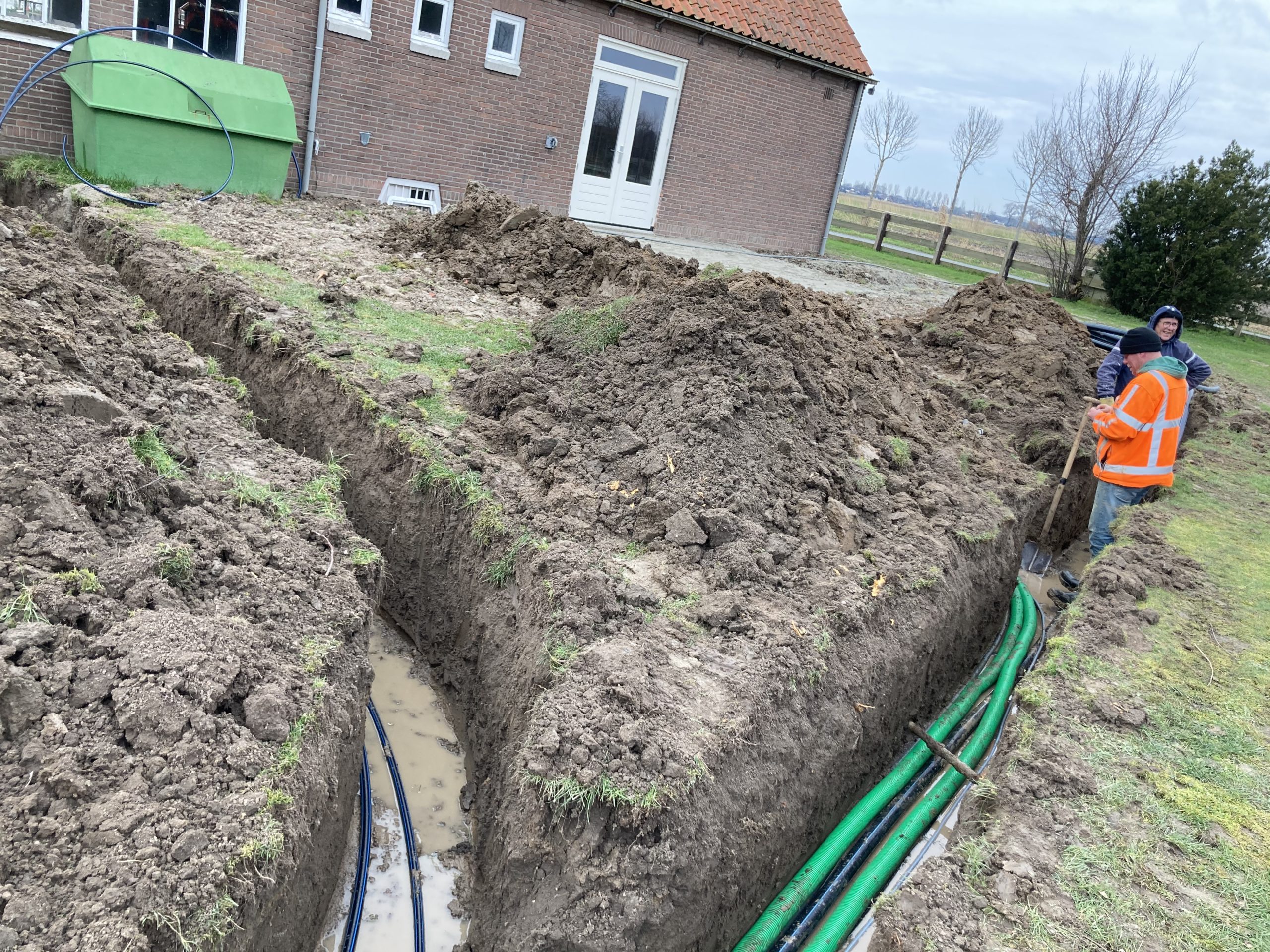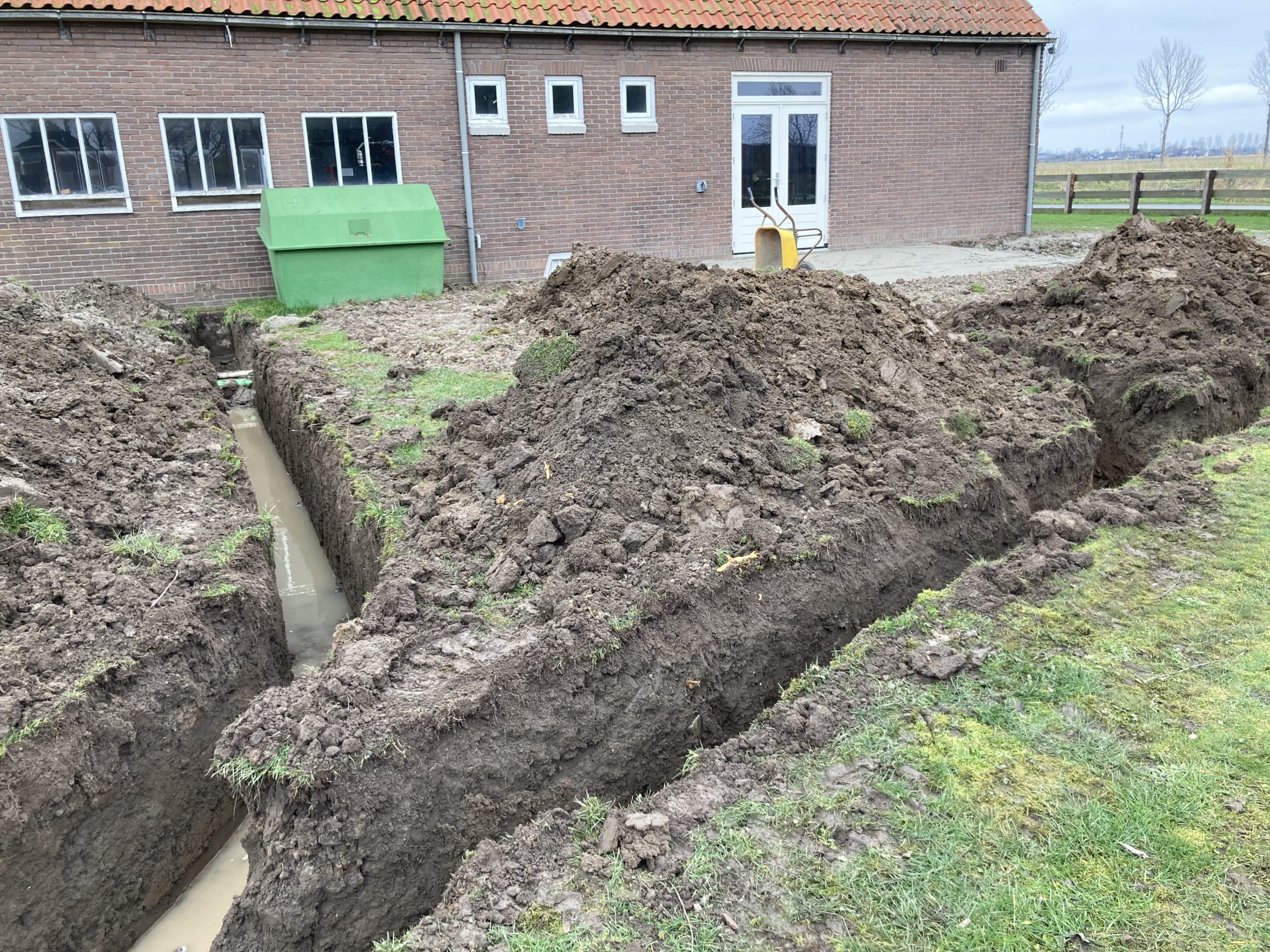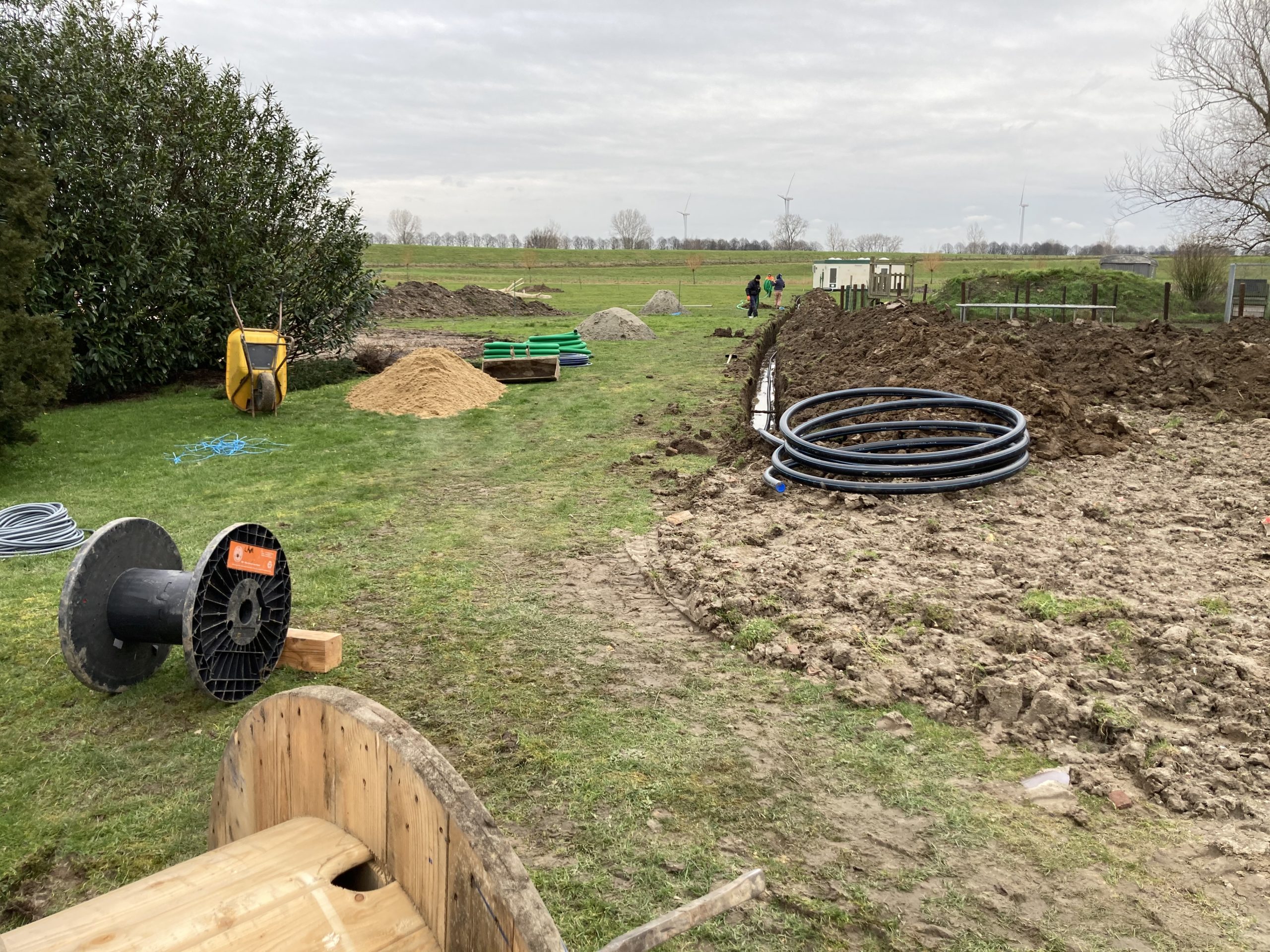 En we hebben bijna 1 km aan buizen, leidingen en kabels van de boerderij naar het sanitair gebouw in de grond gelegd. Op twee punten bij het 2e groepsveld zijn de waterleiding en stroomkabels ook alvast gelegd.