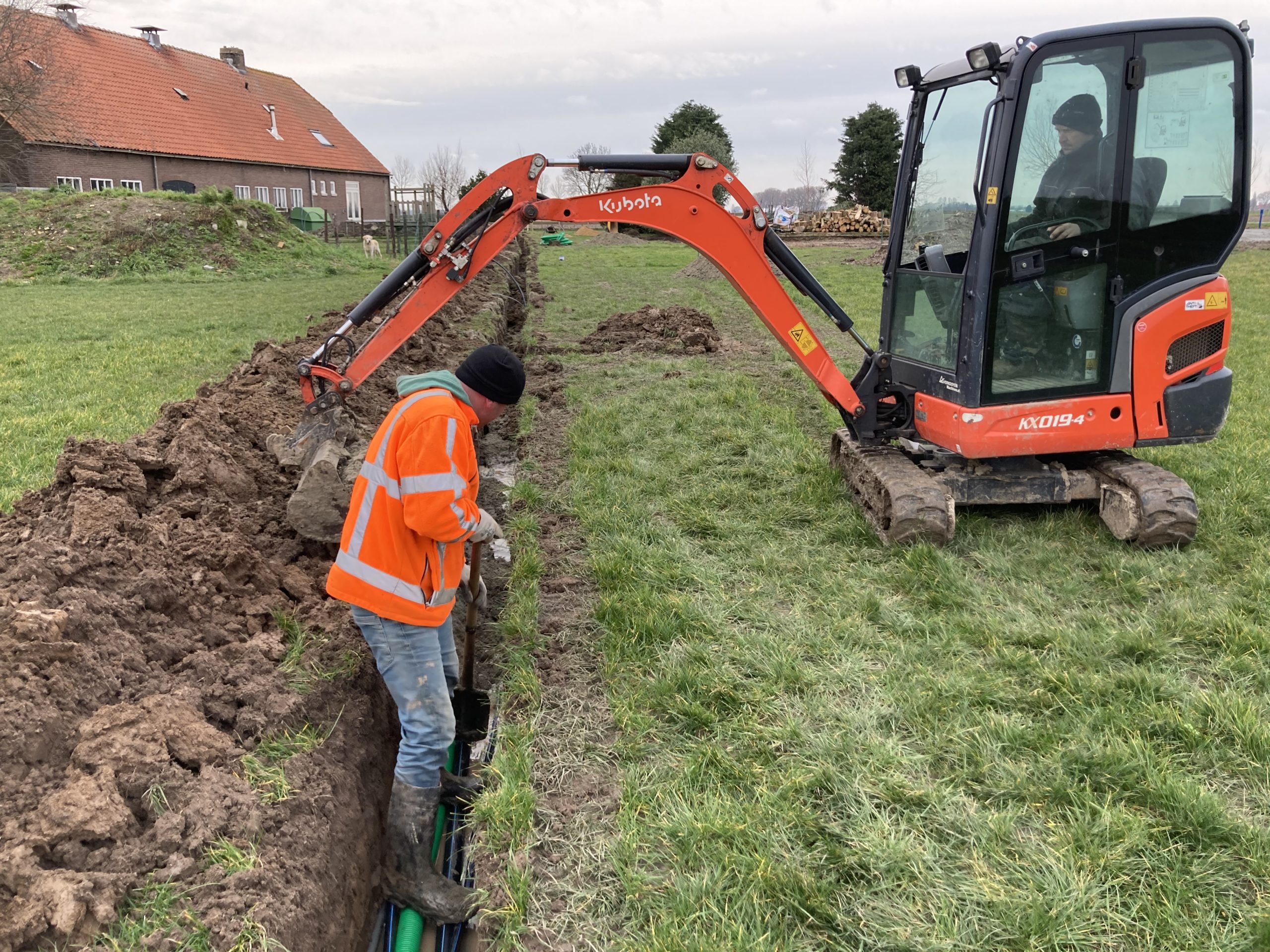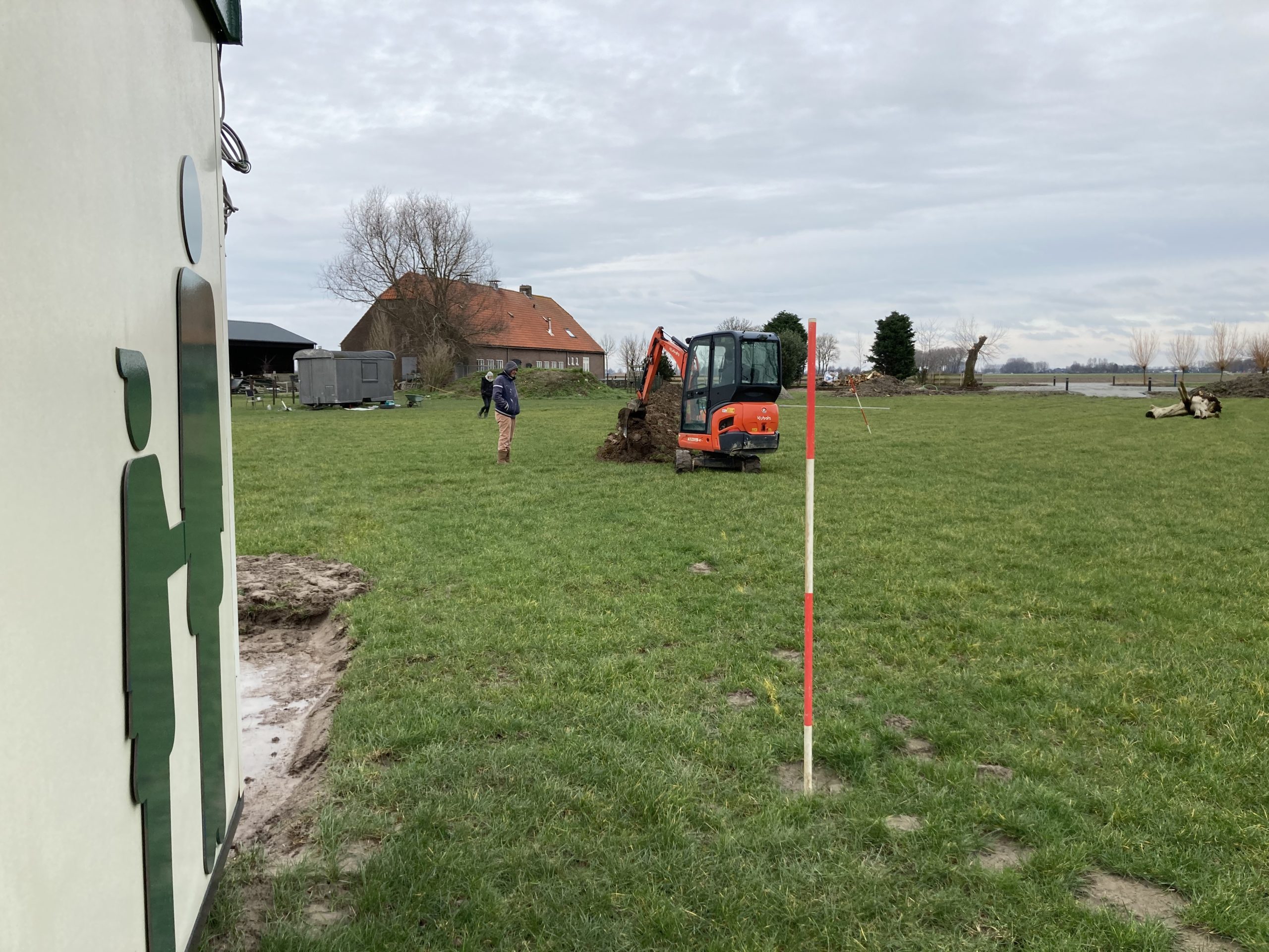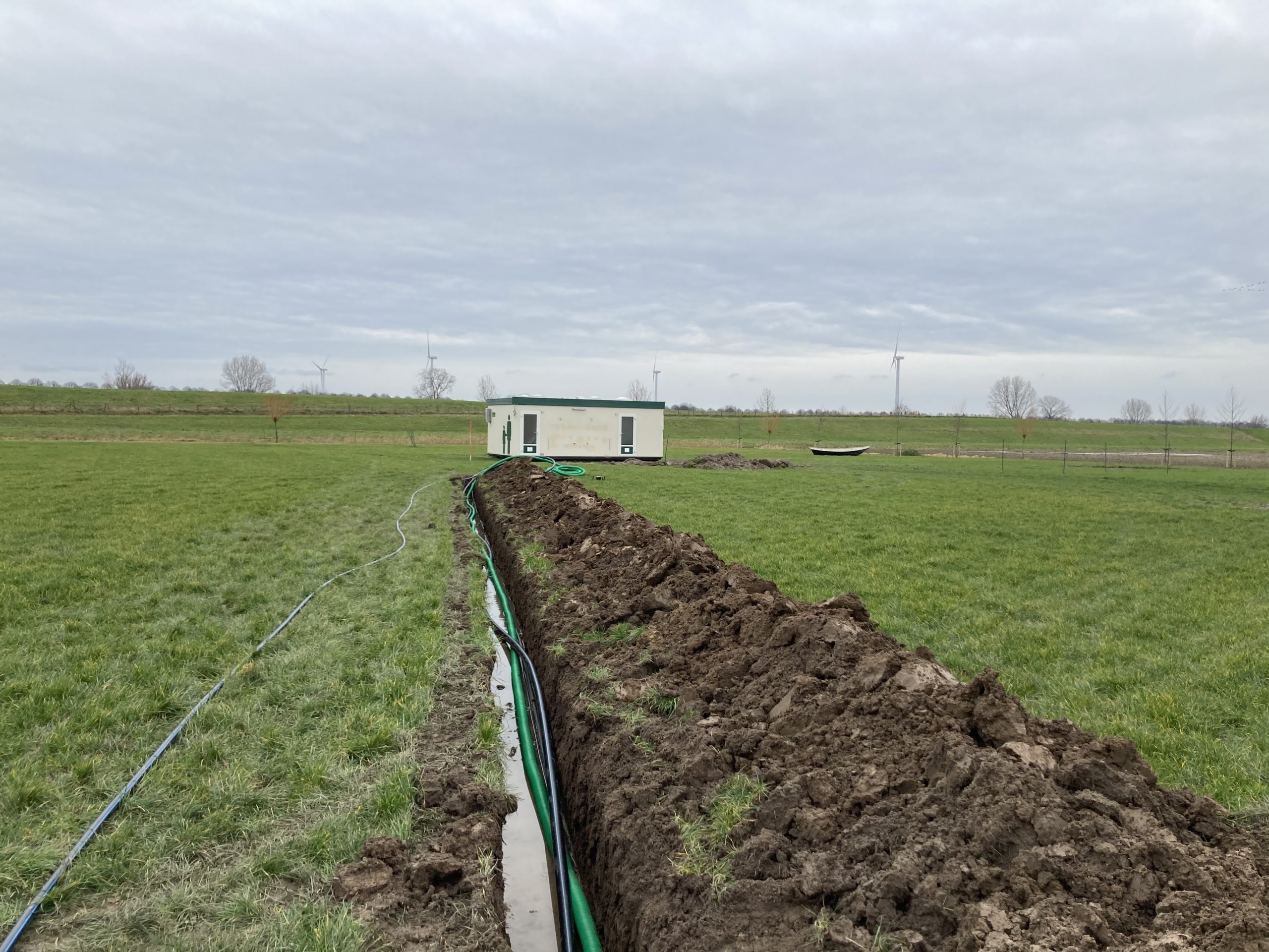 En we hebben bijna 1 km aan buizen, leidingen en kabels van de boerderij naar het sanitair gebouw in de grond gelegd. Op twee punten bij het 2e groepsveld zijn de waterleiding en stroomkabels ook alvast gelegd.