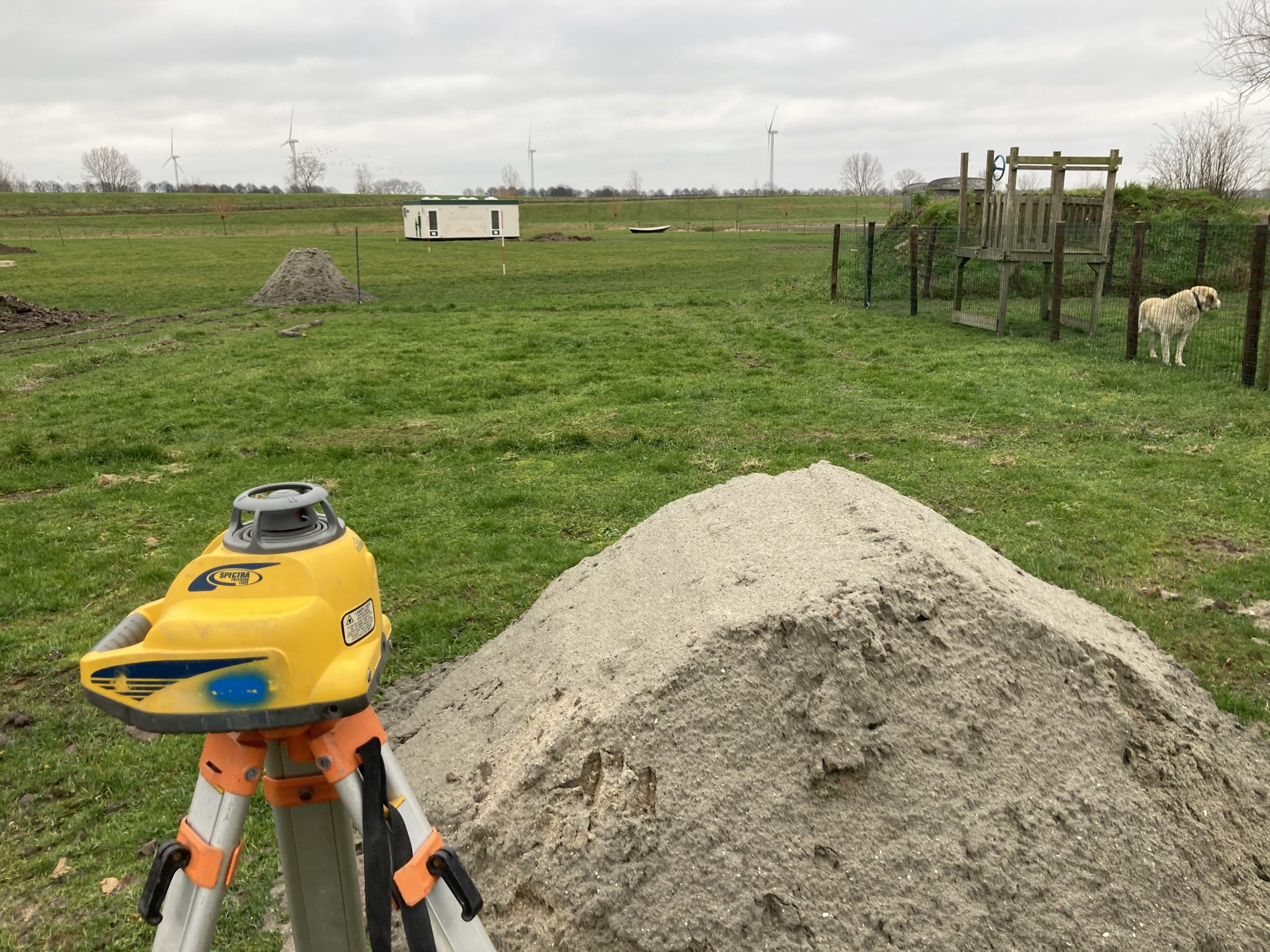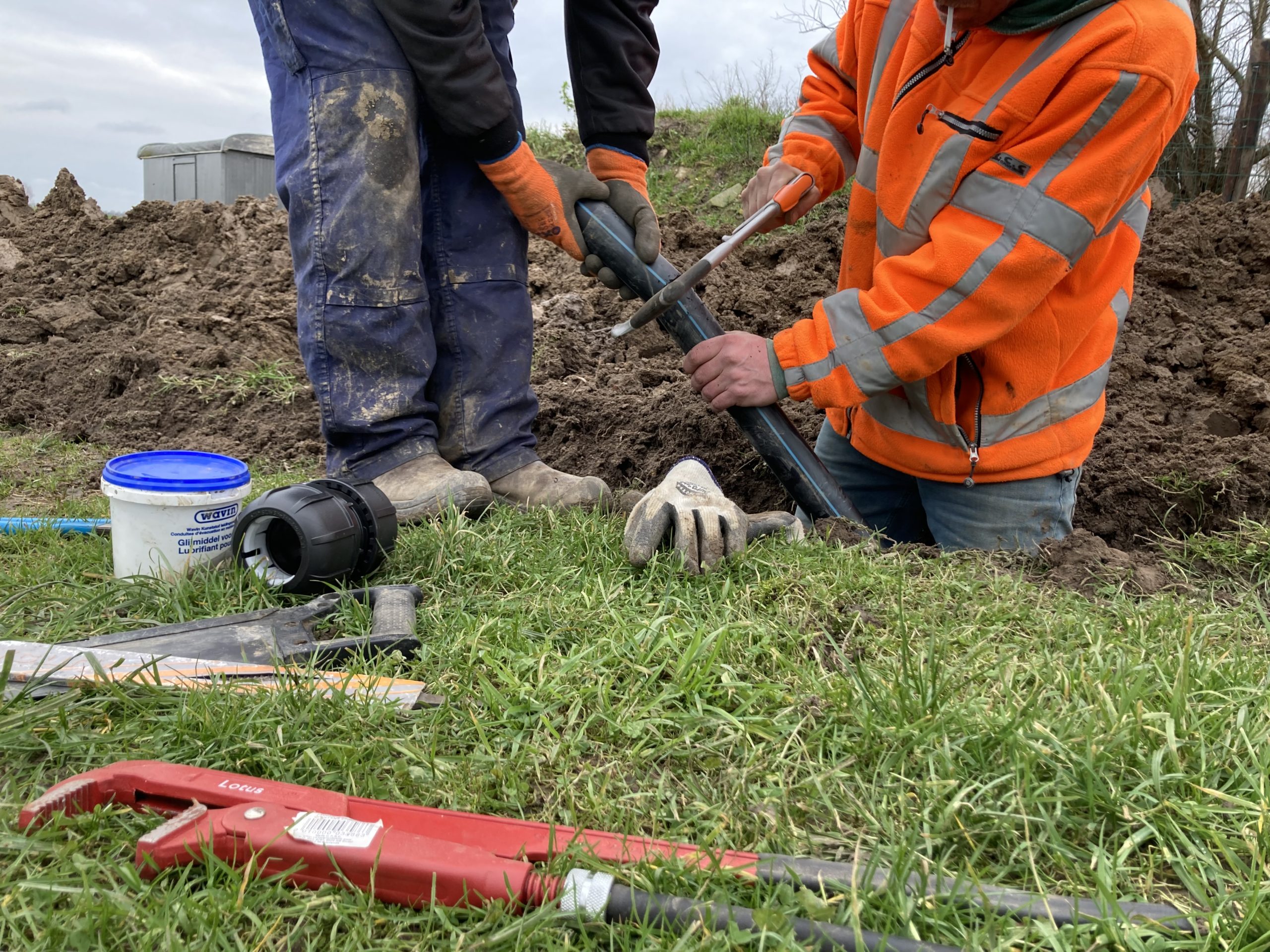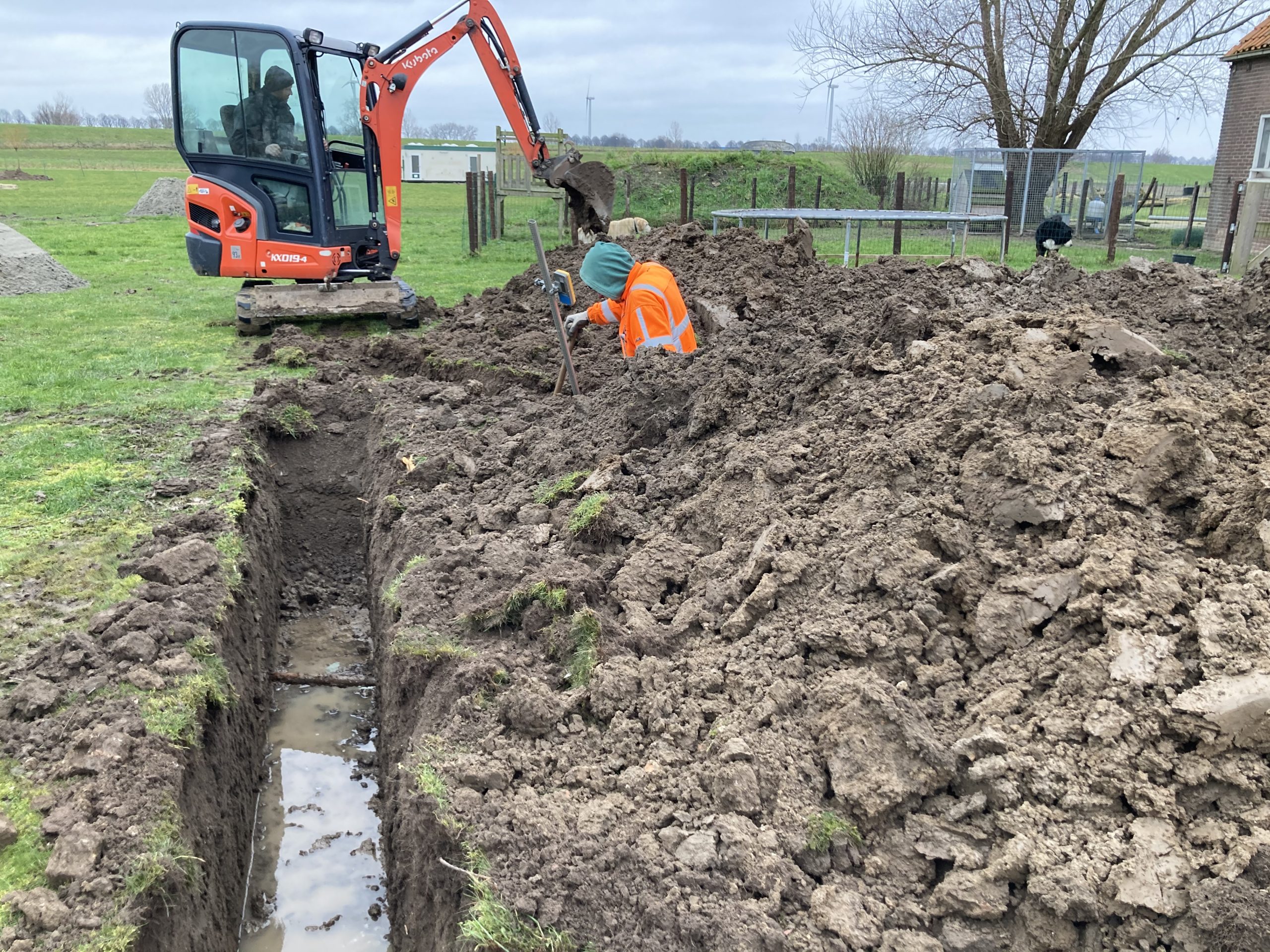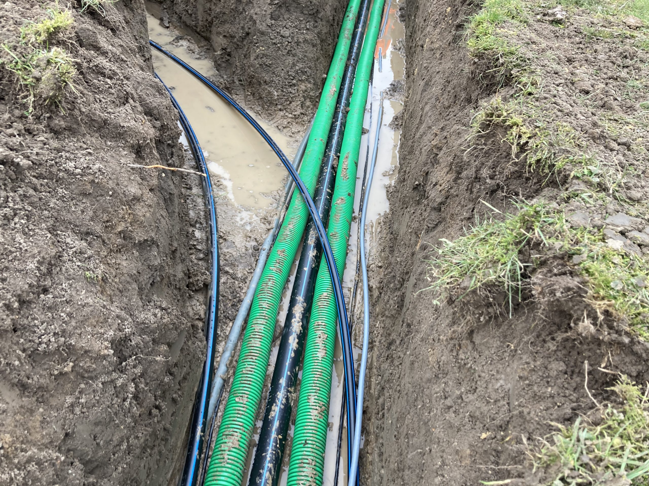 En we hebben bijna 1 km aan buizen, leidingen en kabels van de boerderij naar het sanitair gebouw in de grond gelegd. Op twee punten bij het 2e groepsveld zijn de waterleiding en stroomkabels ook alvast gelegd.