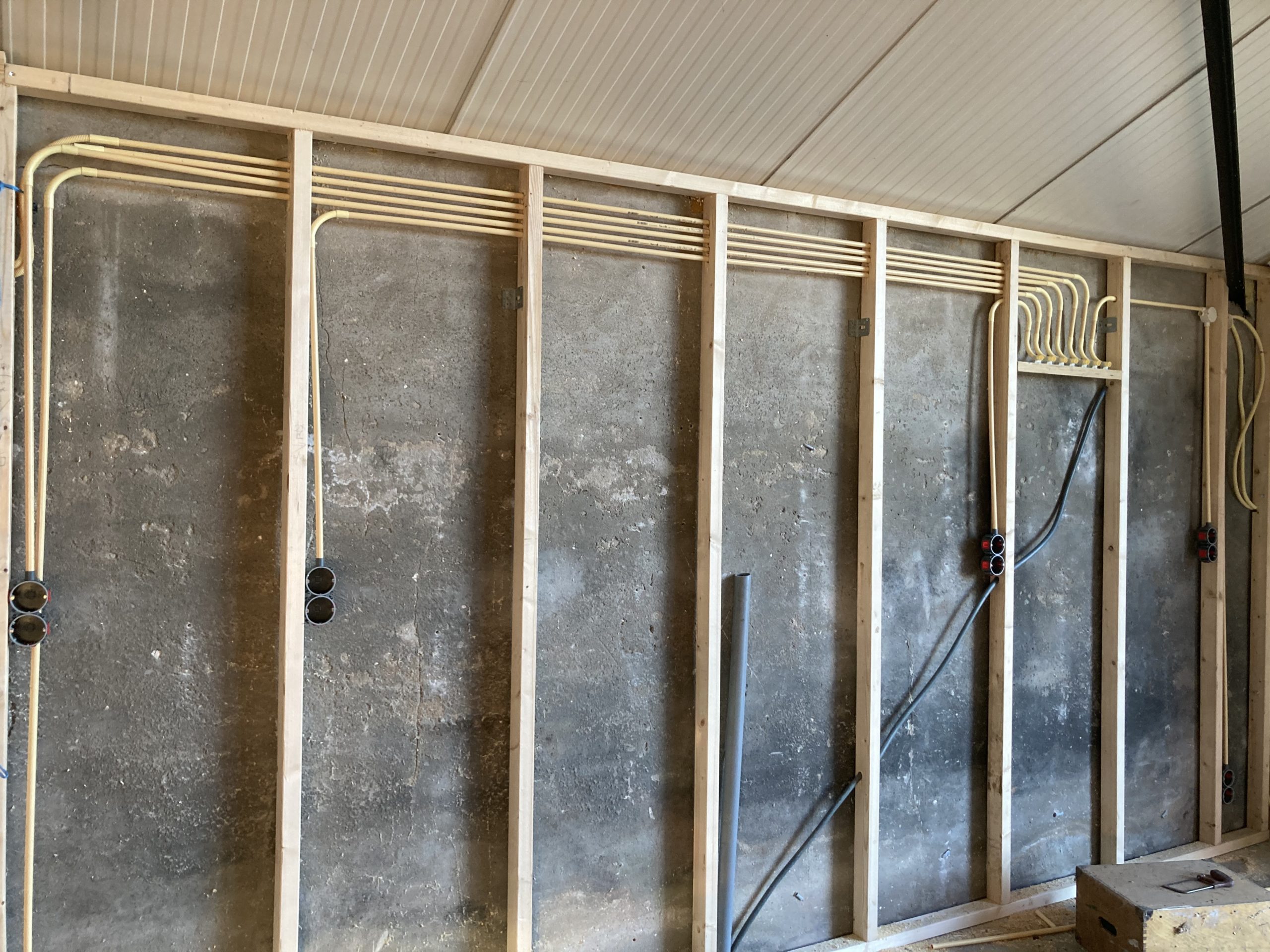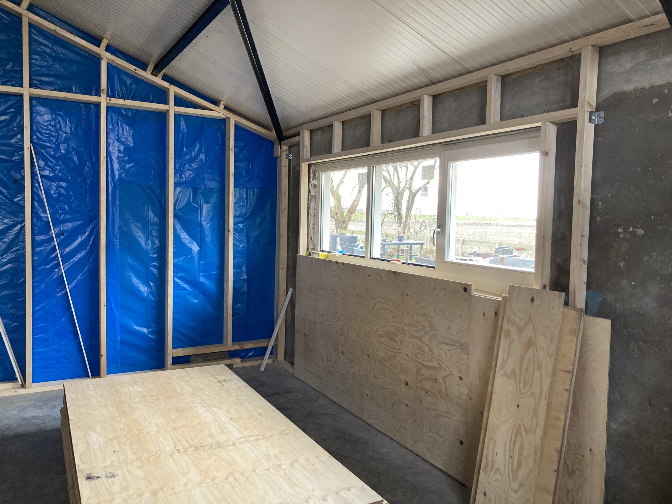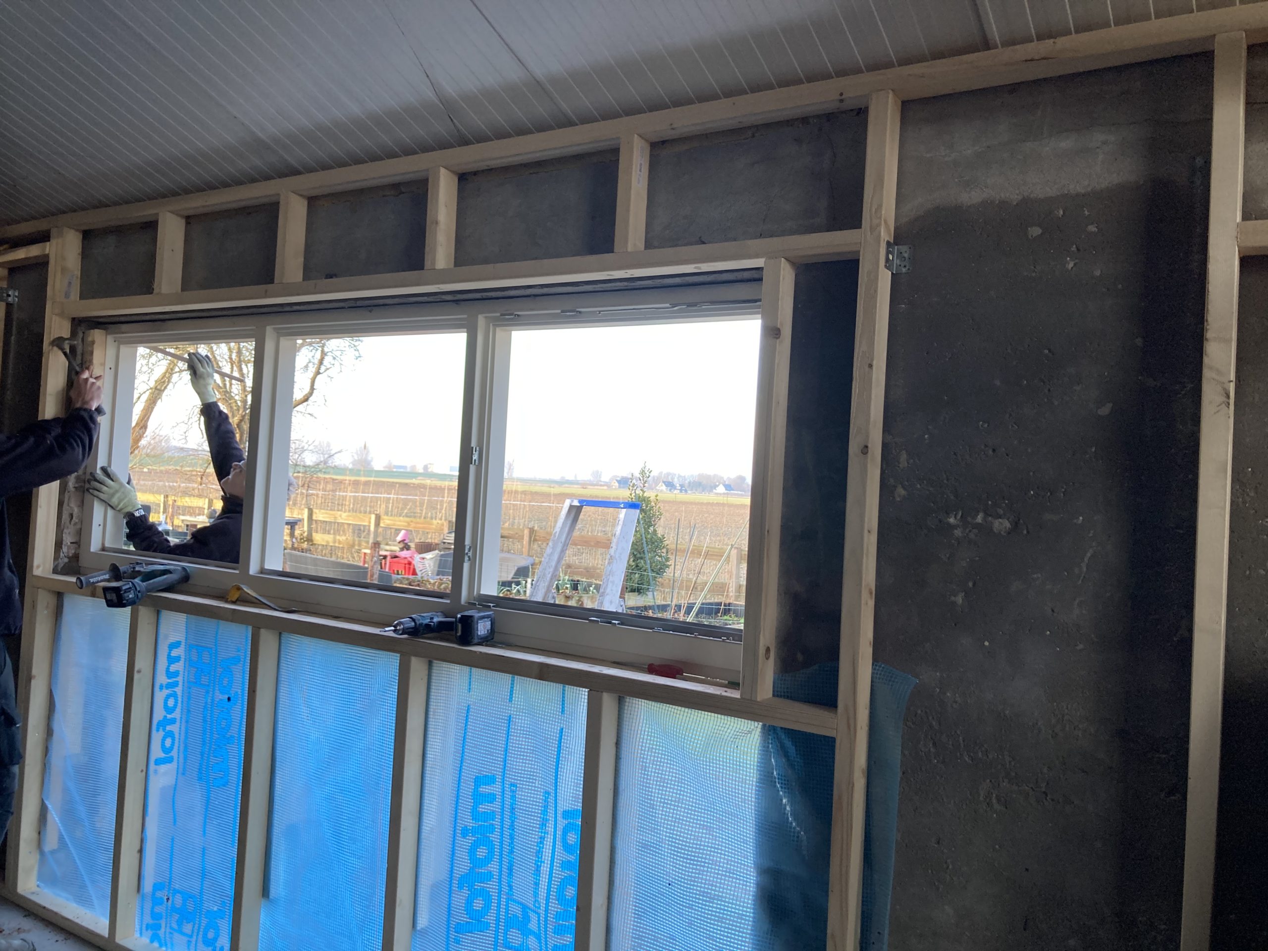 Verder zijn we begonnen aan de receptie en horeca in de kapschuur. Er is een raam geplaatst wat zorgt voor heerlijk daglicht en een weids uitzicht. Verder zijn we nu hier een tussenwand aan het zetten, tegen de buitenmuur maken we een voorzet wand en we hebben deze week de elektra voorbereid.