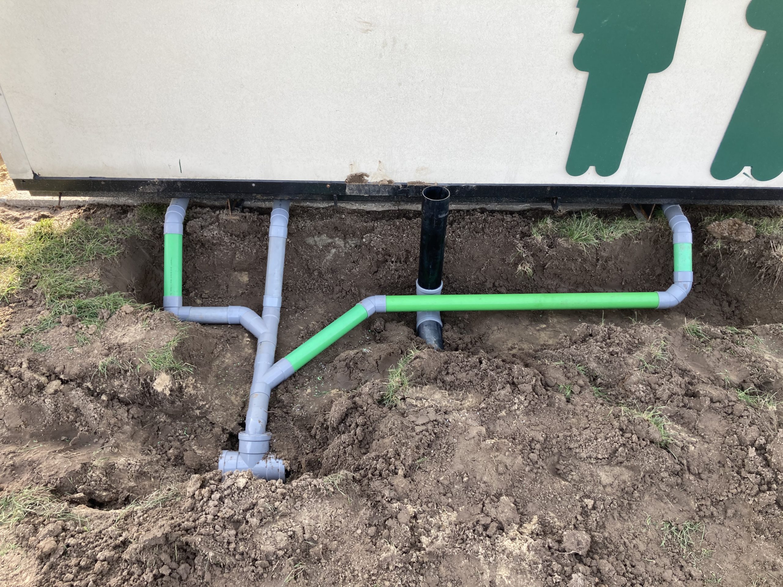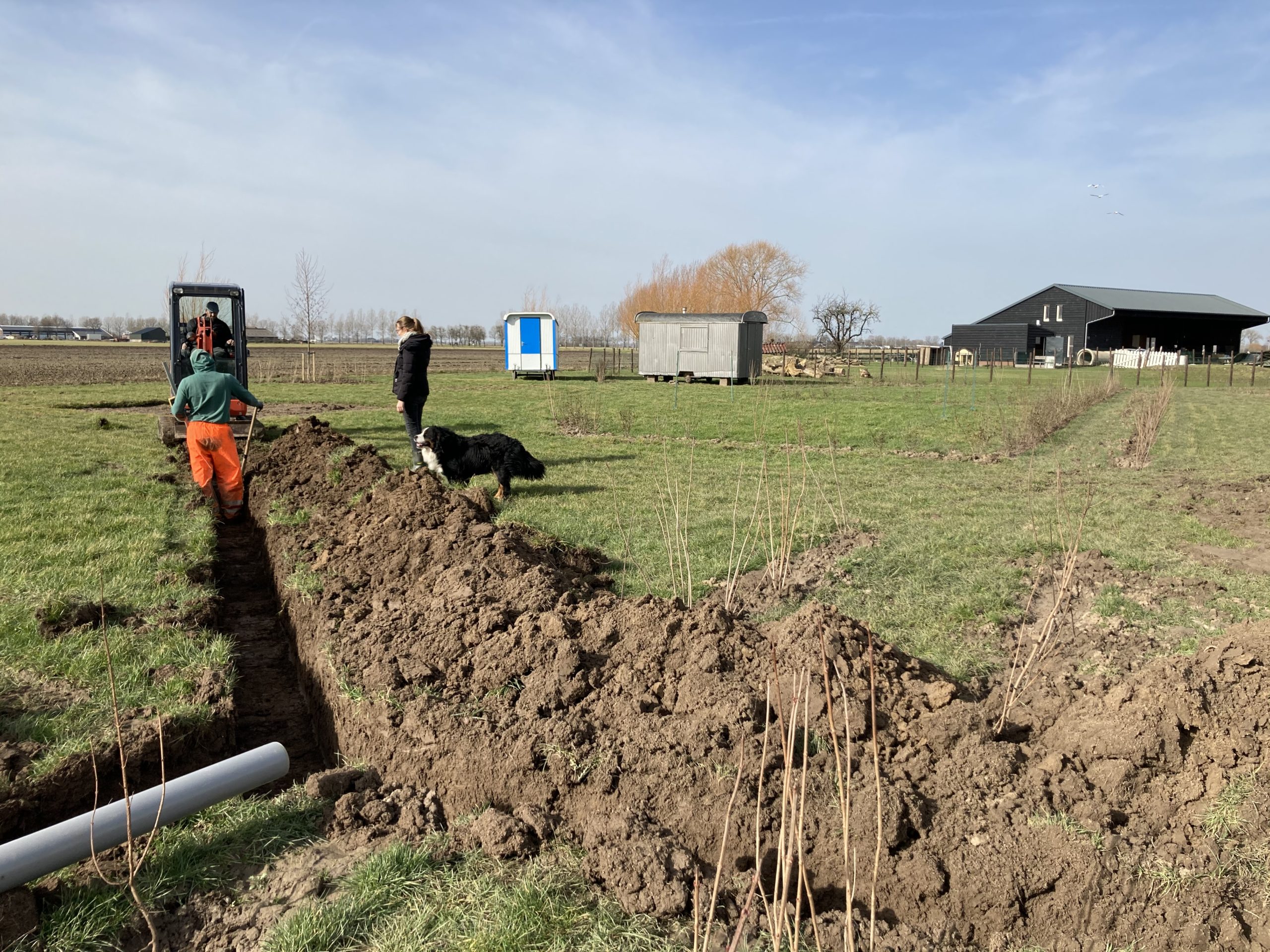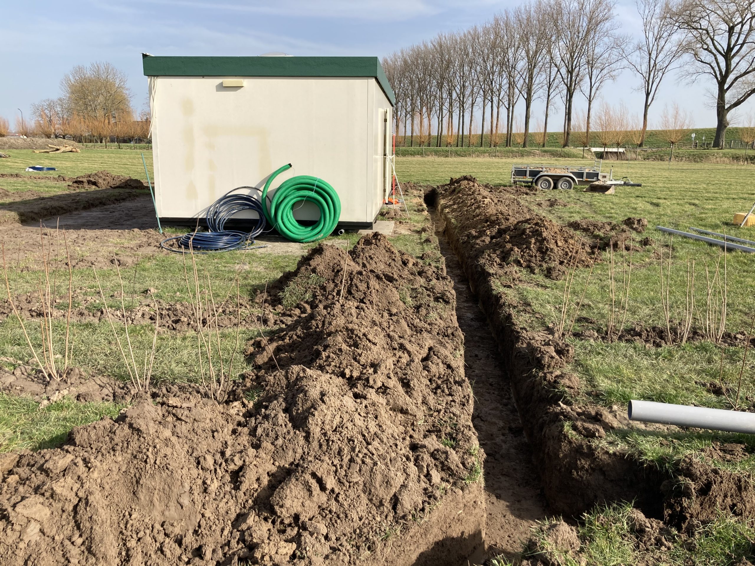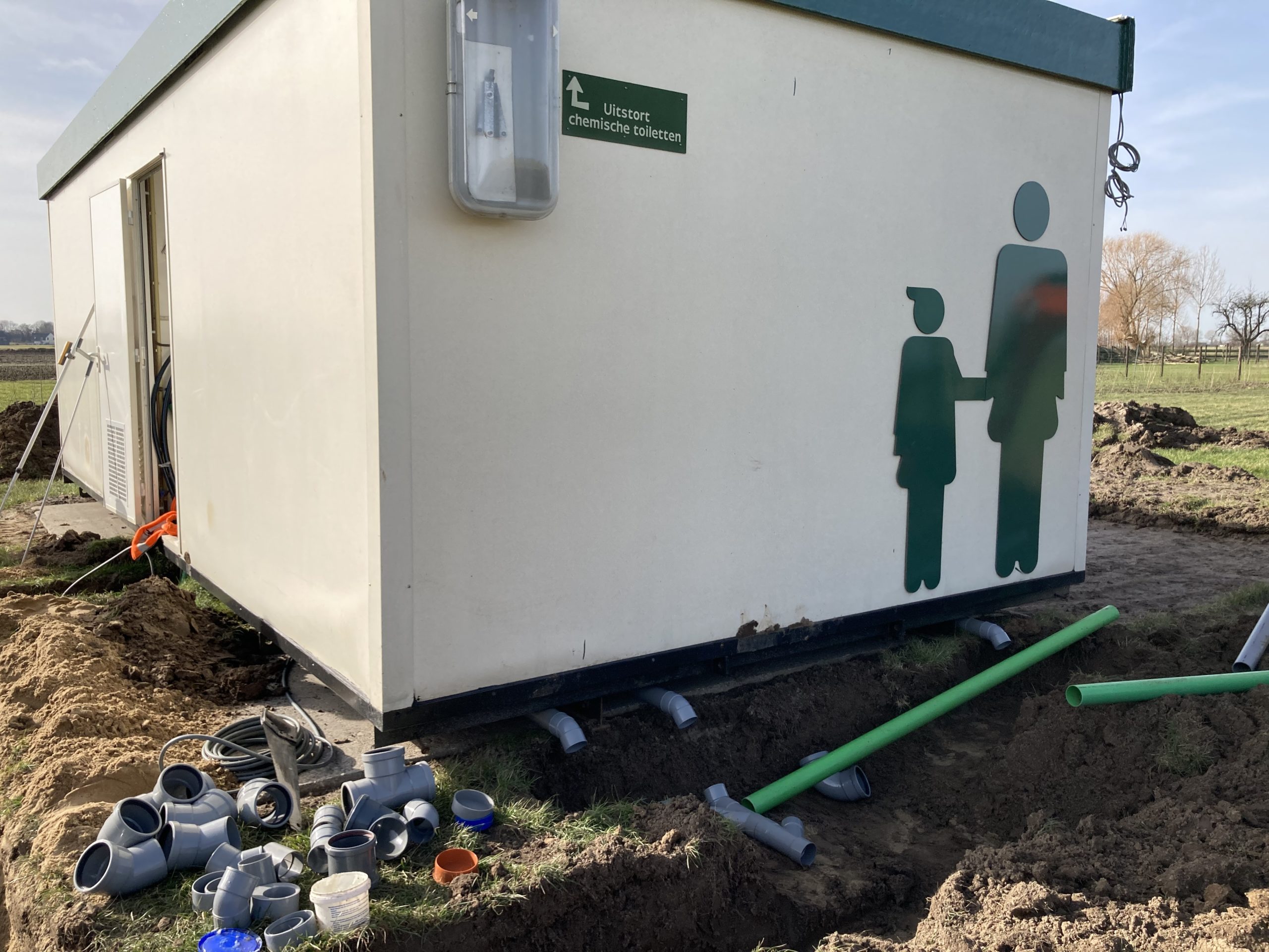 Nadat de sneeuw is gesmolten zijn we direct verder gegaan met het laatste stukje om de leidingen naar het sanitair gebouw te leggen. We hebben alles netjes naar binnen gebracht en de afvoer aangesloten. Vanuit het sanitair gebouw gaan we verder sleuven graven naar de comfort plekken, de lounge(!) en de groepsvelden zodat we deze kunnen voorzien van water en stroom.