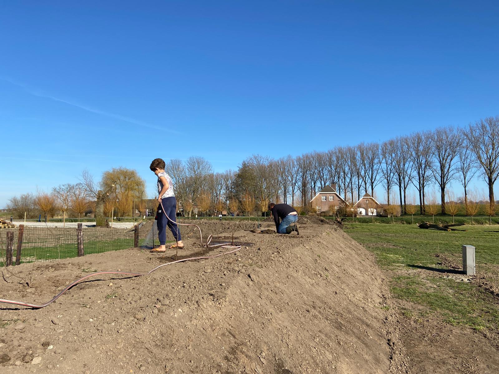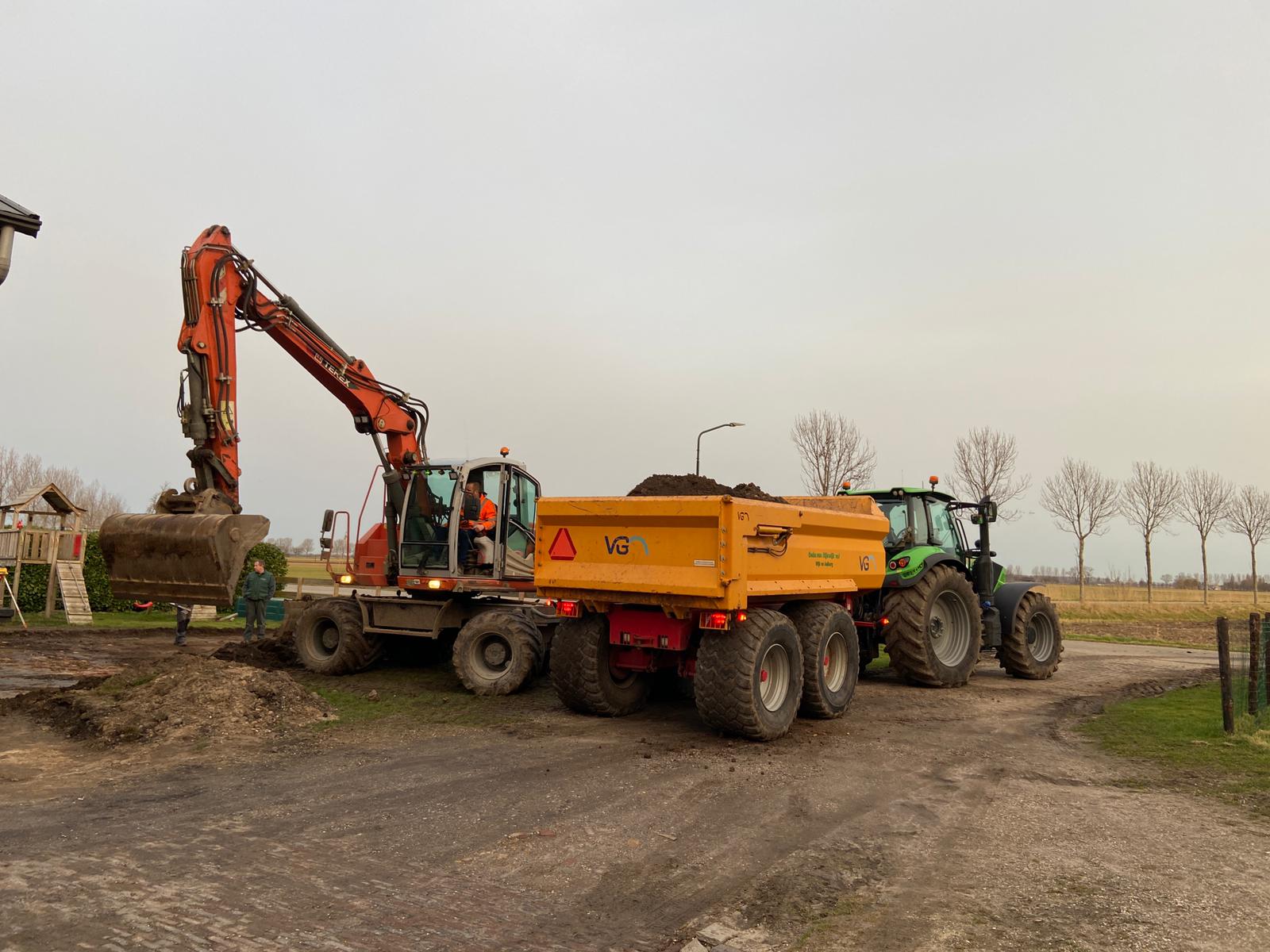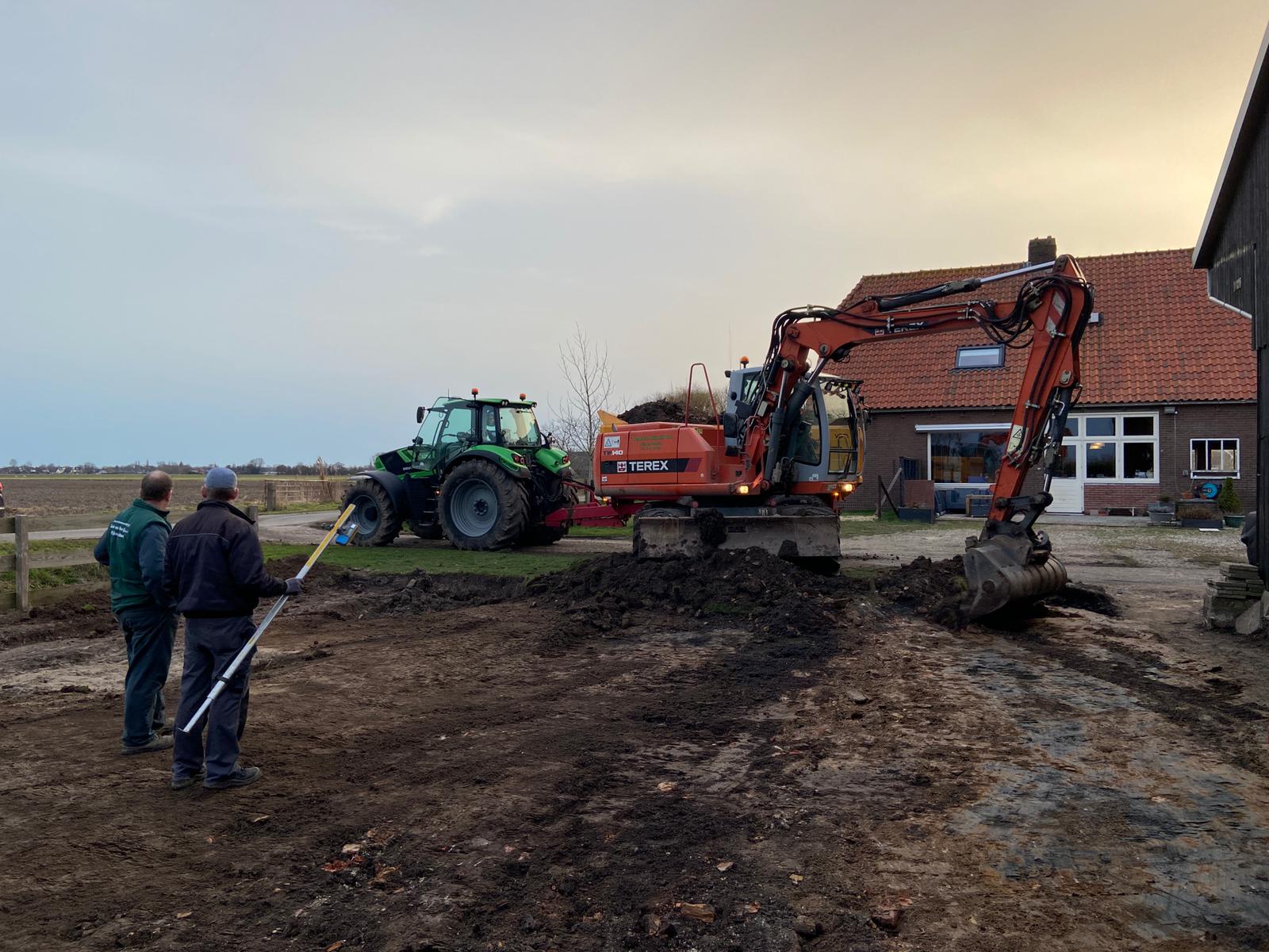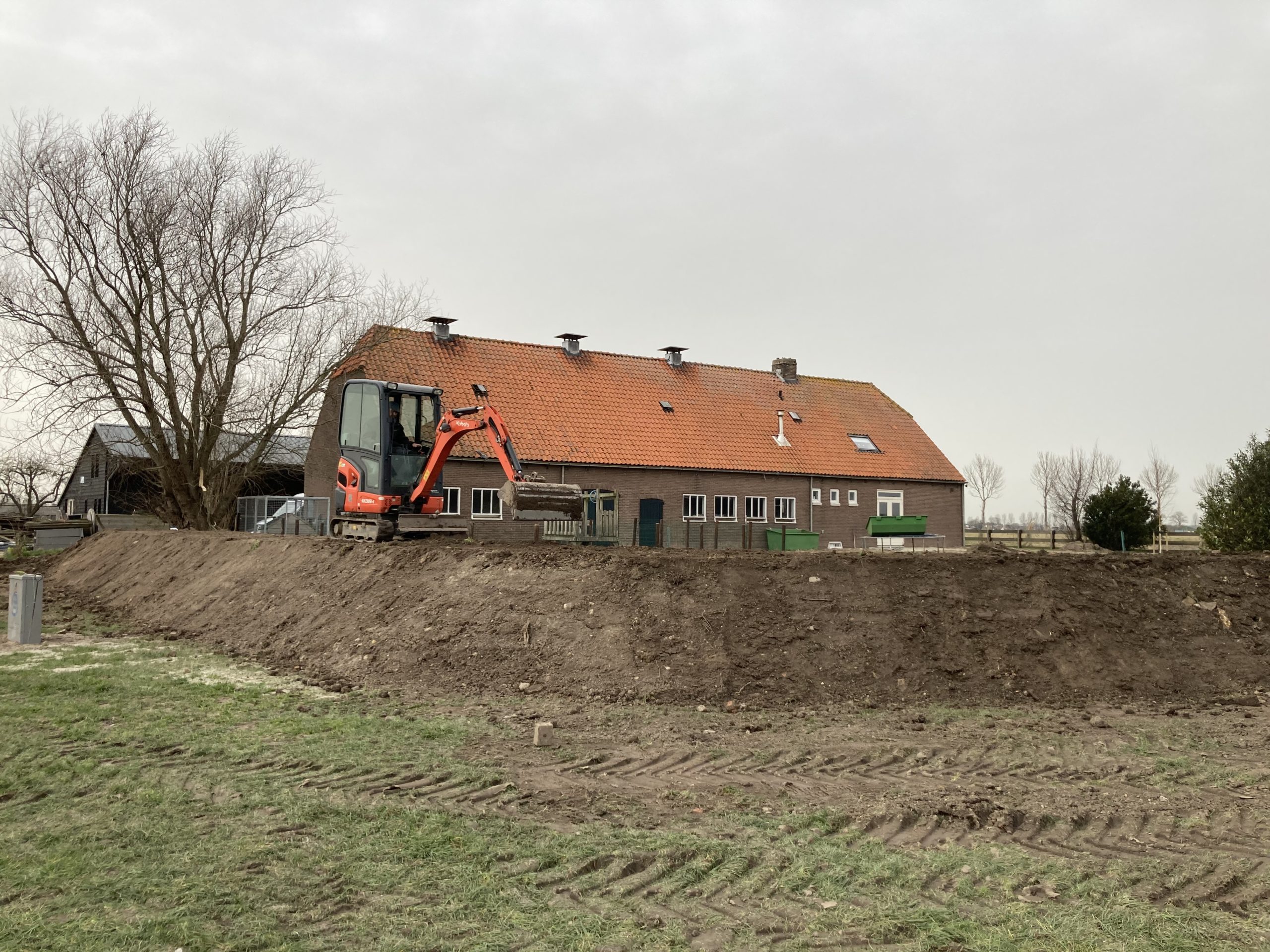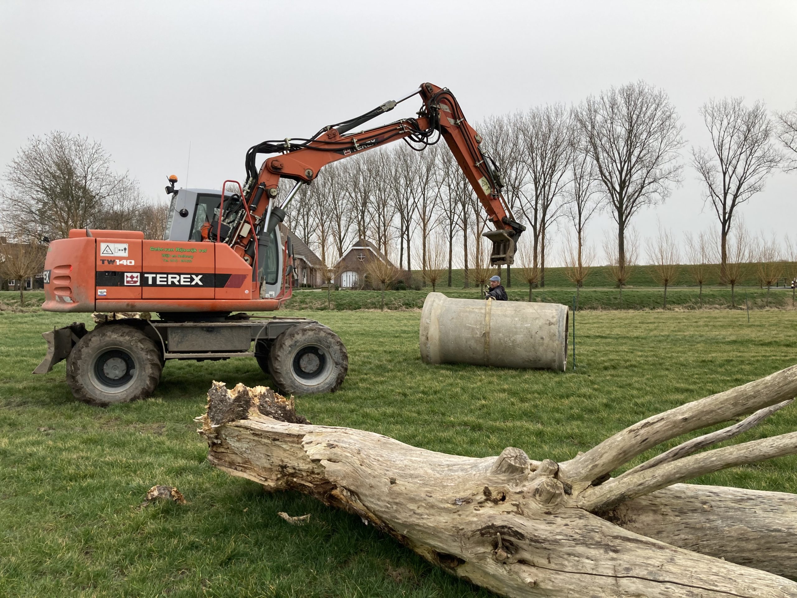 Maandag kwam de grote kraan en hebben we het terras bij de horeca/receptie afgegraven. De grond hebben we gebruikt om een wal te maken tussen de camping en het privé gedeelte. Op de wal hebben we direct weer enkele van de eerder opgekuilde planten geplaatst.