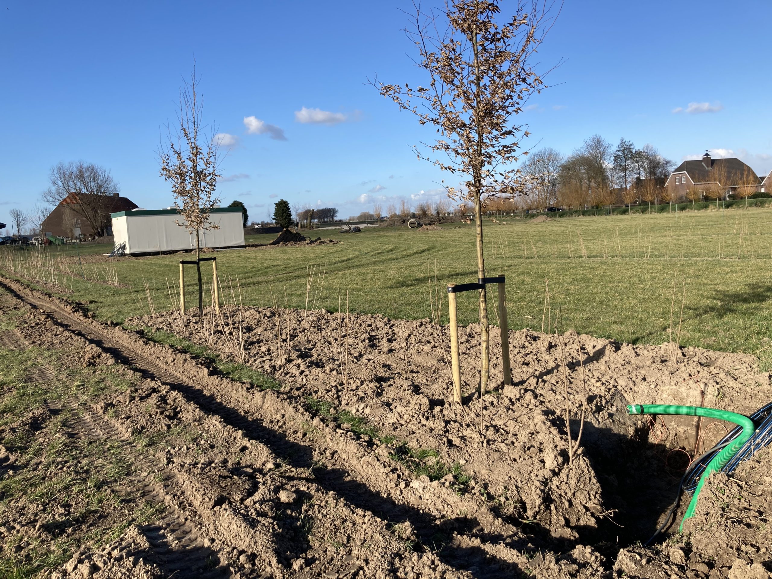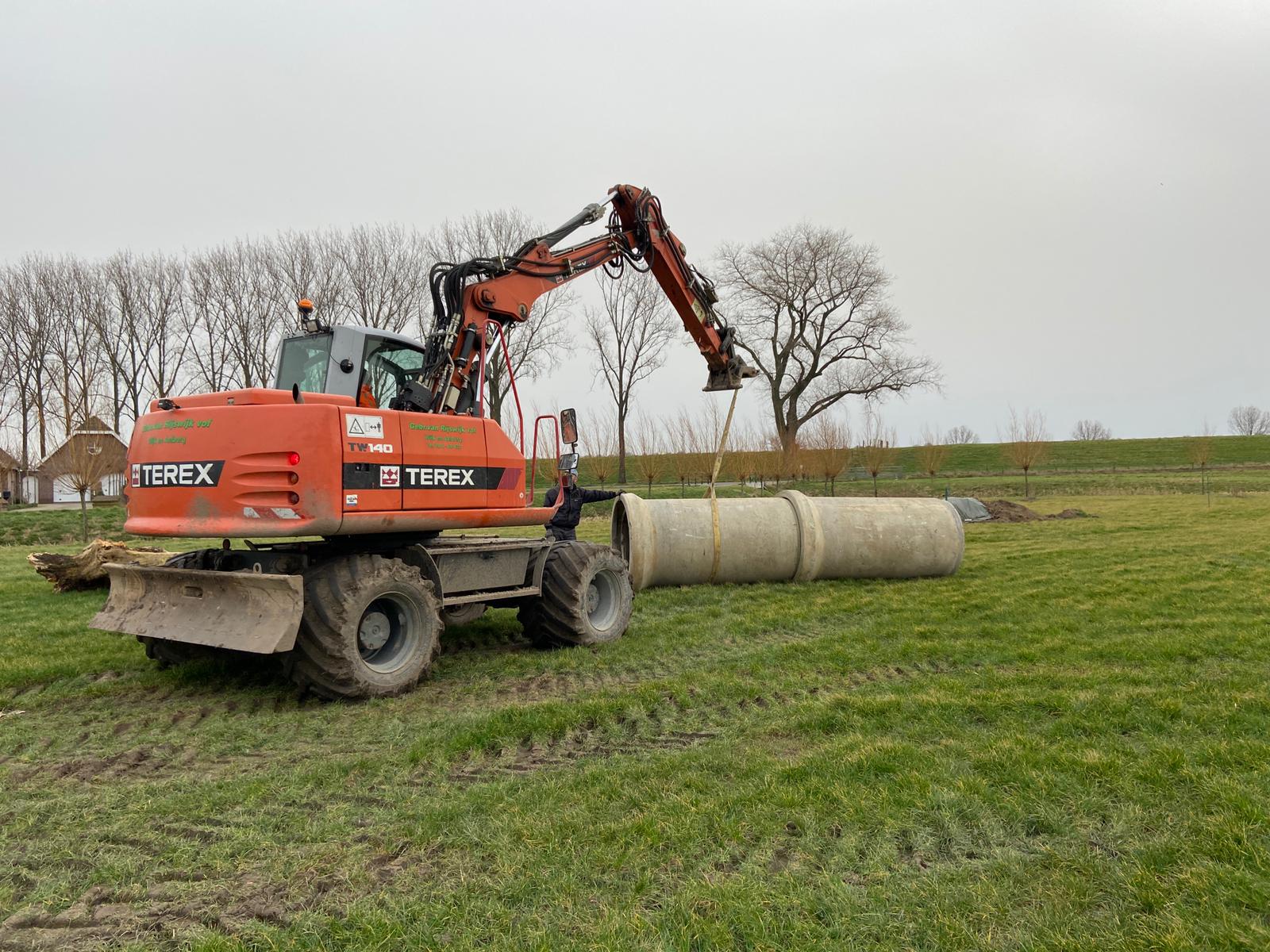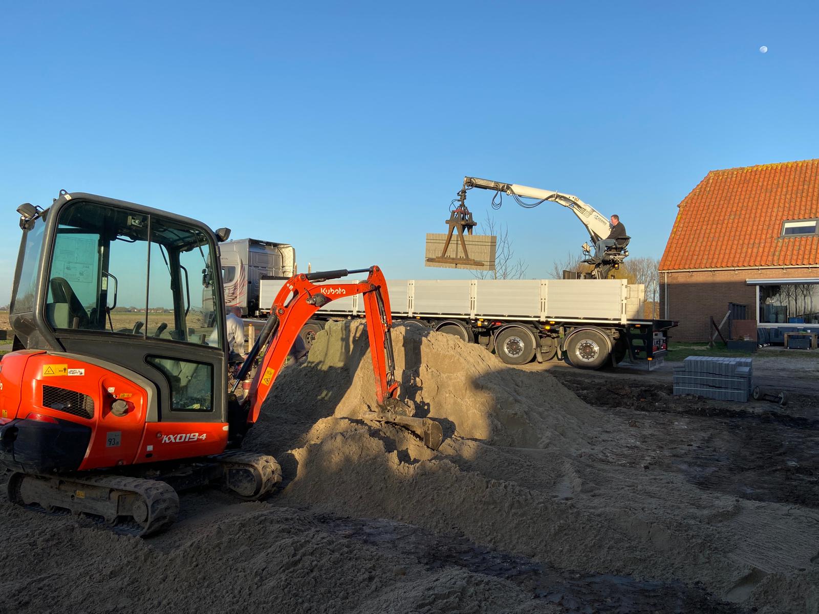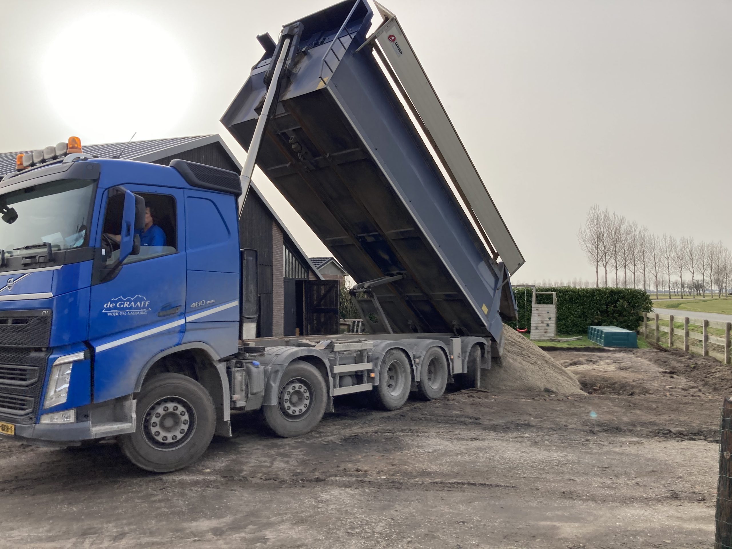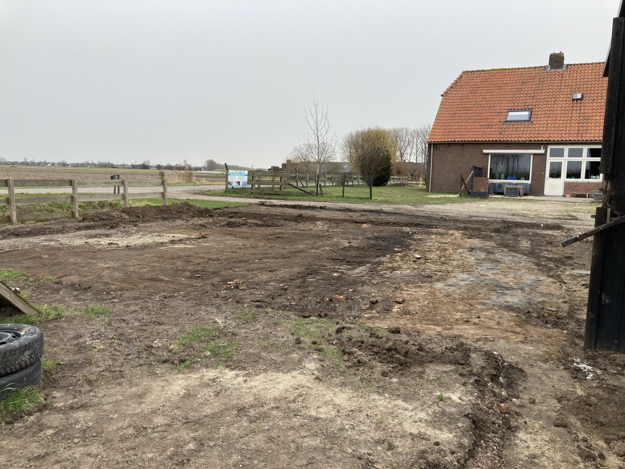 Maandag kwam de grote kraan en hebben we het terras bij de horeca/receptie afgegraven. De grond hebben we gebruikt om een wal te maken tussen de camping en het privé gedeelte. Op de wal hebben we direct weer enkele van de eerder opgekuilde planten geplaatst.